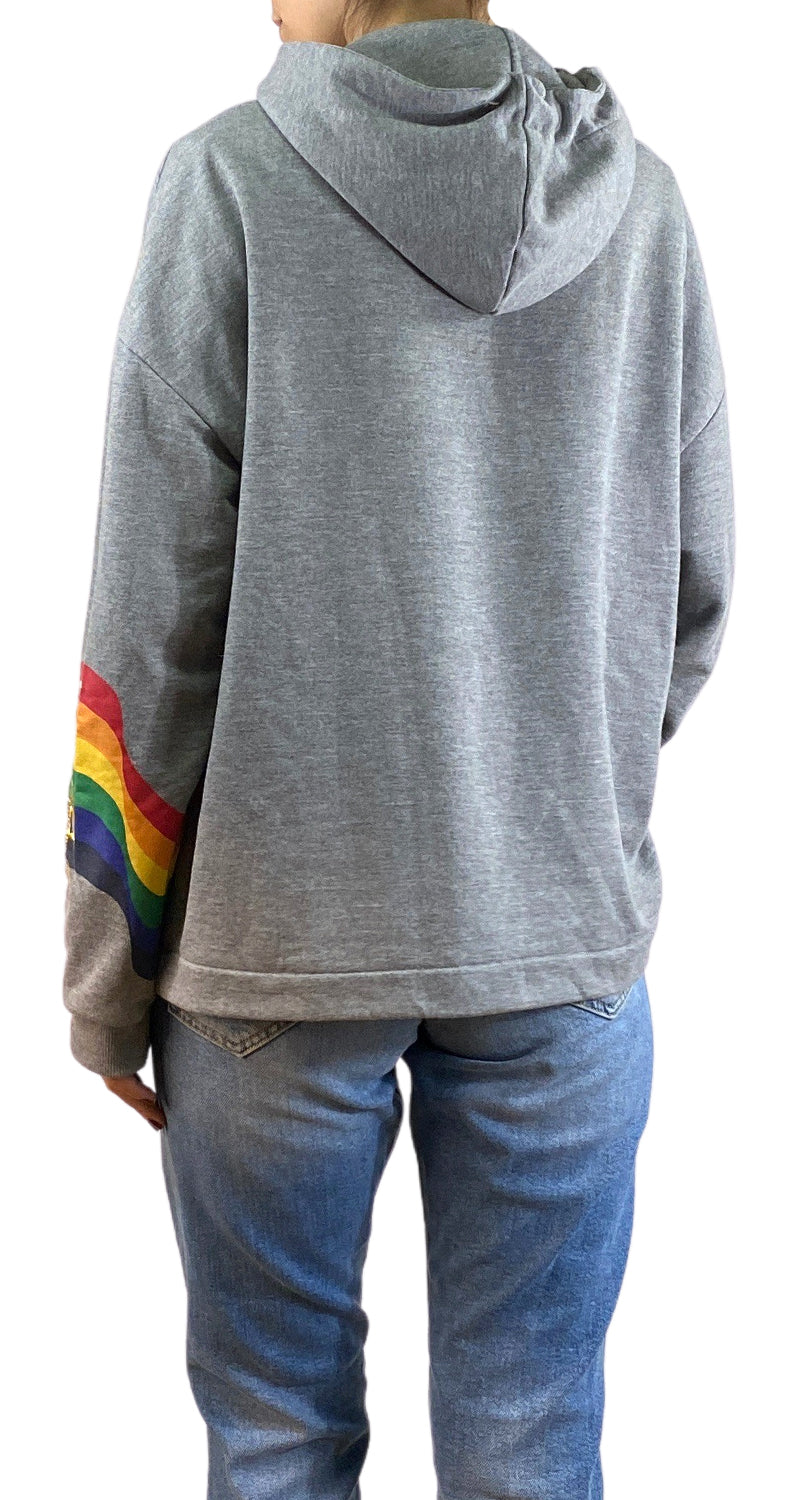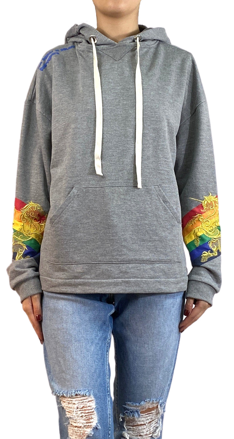 Polerón Gris con bordado de león dorado sobre franja de colores. Tiene gorro. Talla 2 de la marca