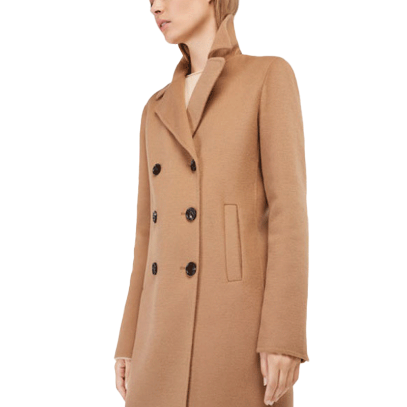 Abrigo Camel estilo double breasted con bolsillos delanteros tipo ojal.