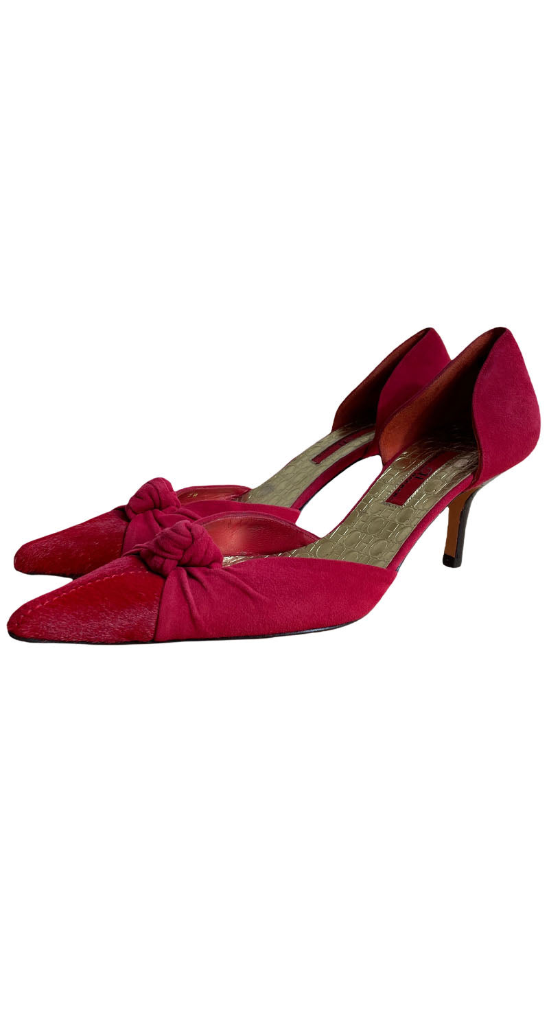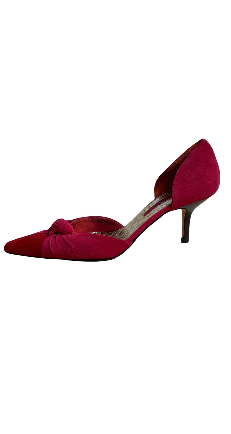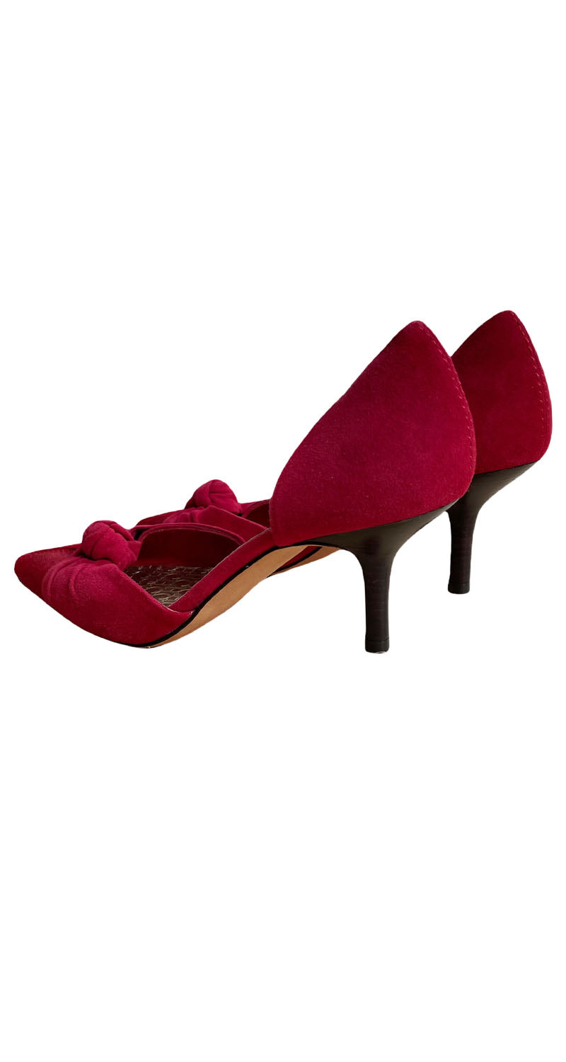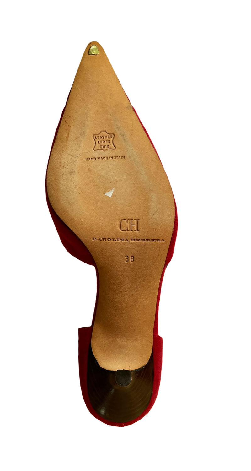 Tacones en punta color Rojo con plantilla Dorada y textura de Gamuza. Medida de taco: 7 cm. Leves signos de uso en suela. Incluye bolsa protectora.