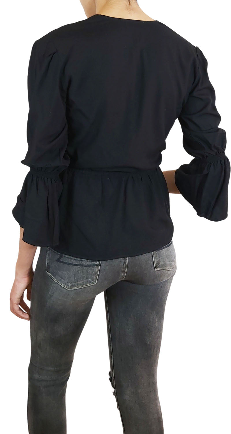 Blusa color Negro manga larga con puño elásticado, escote en V pronunciado, vuelos en pinza delantera y amarre en cintura.