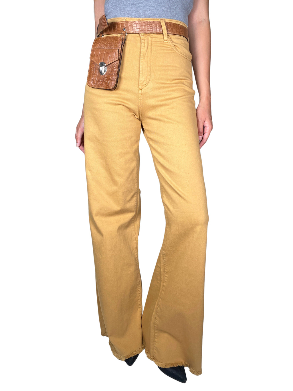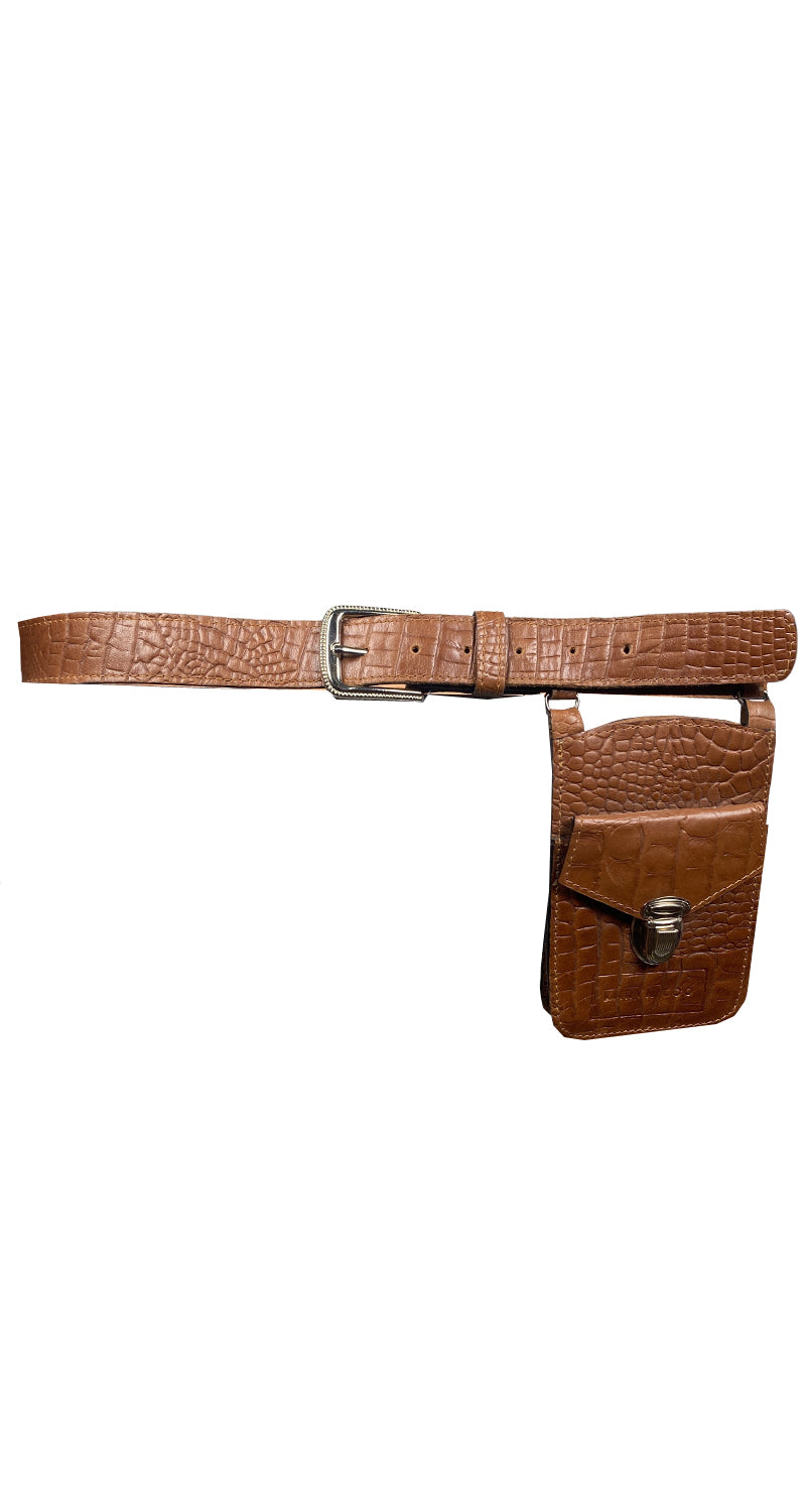 El material se siente como cuero. Medidas: cinturón 89x3 cm, bolsillo 15x10 cm.