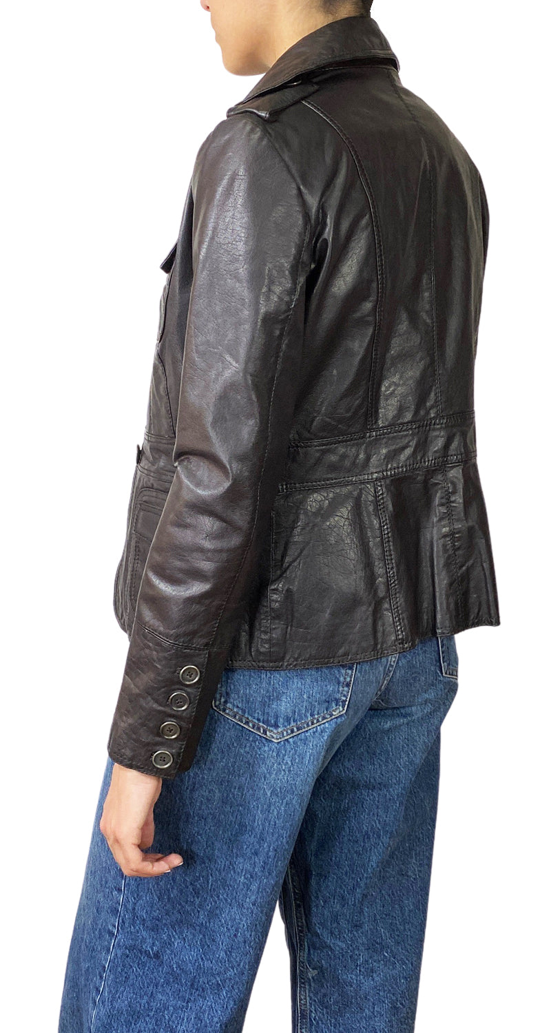 Chaqueta café de cuero con botone y bolsillos en delantero.