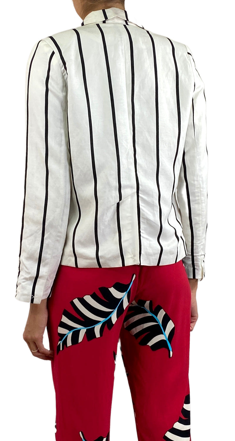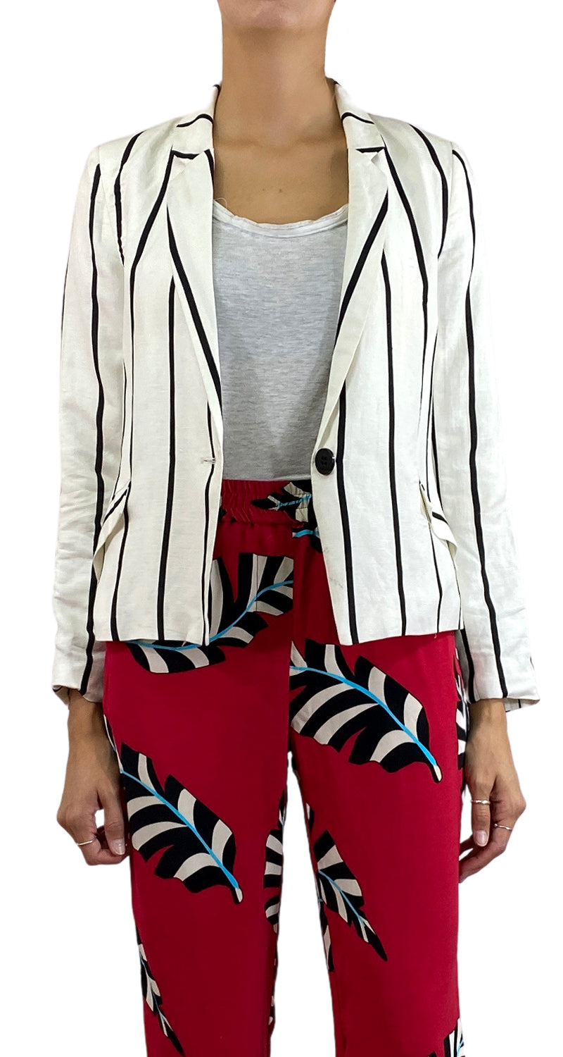 Saco color Blanco de lino con diseño de rayas en Negro y bolsillos externos.
