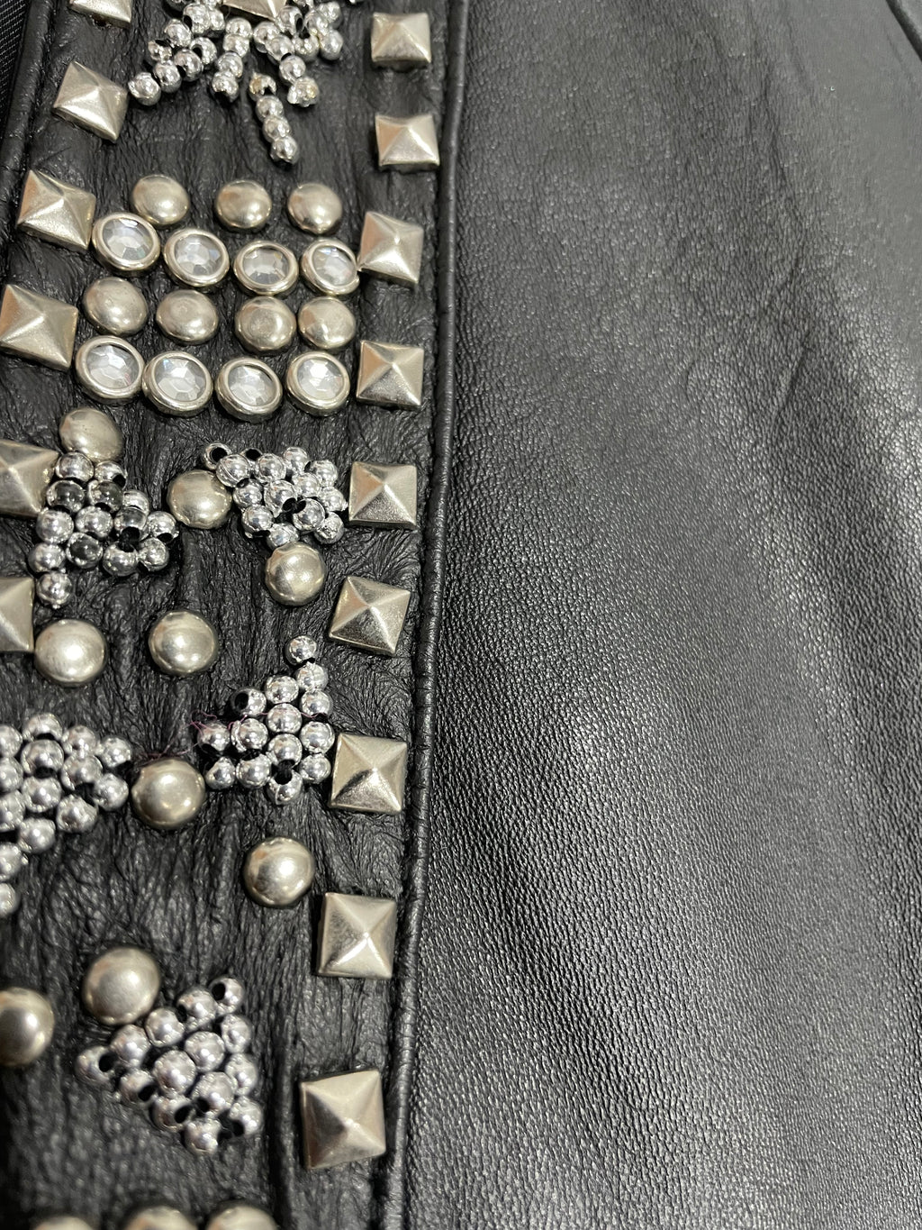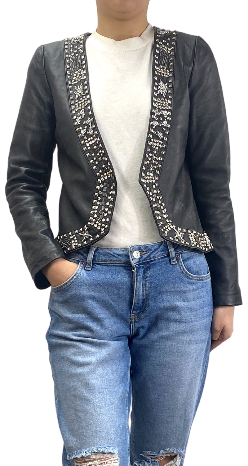 Chaqueta de cuero color Negro con aplicaciones de tachas, mostacillas, canutillos y brillantes.