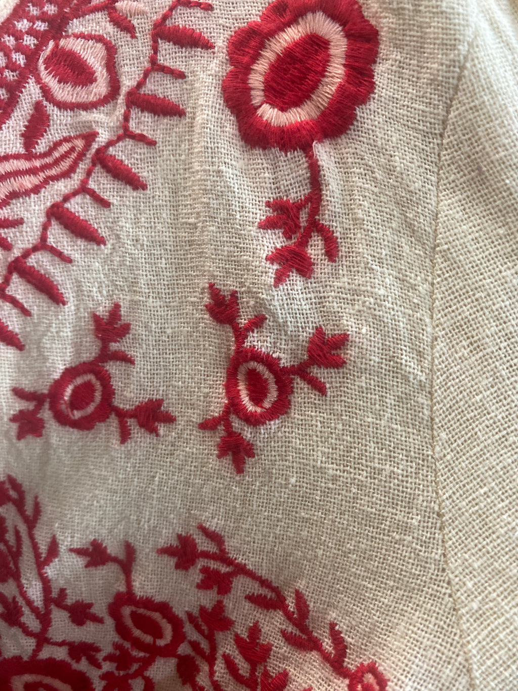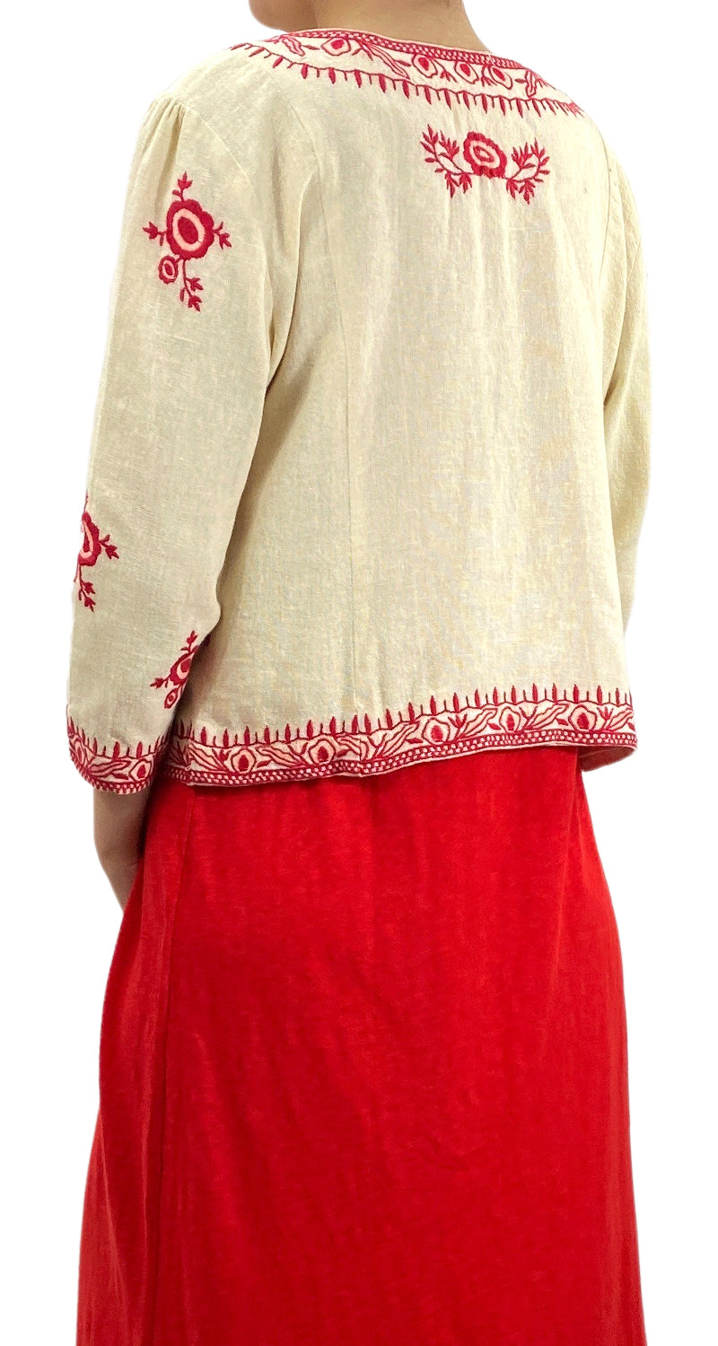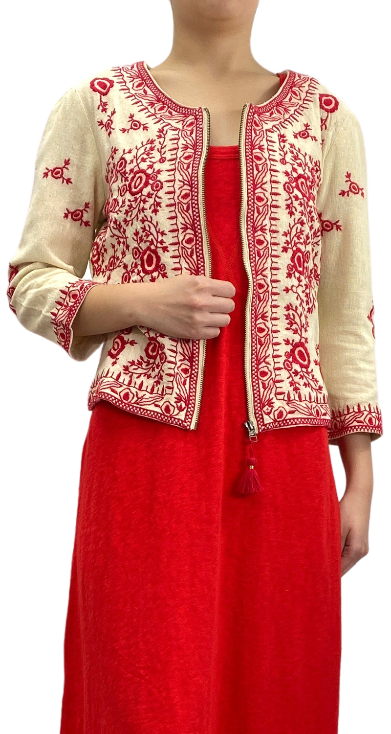 Saco color Beige con cierre y bordado de flores en hilos Rojos.