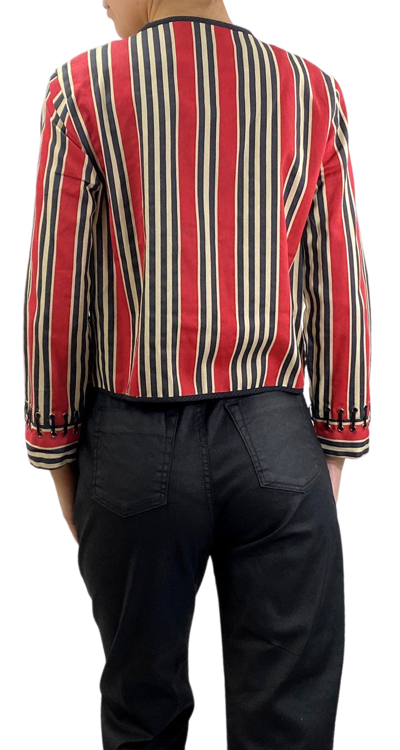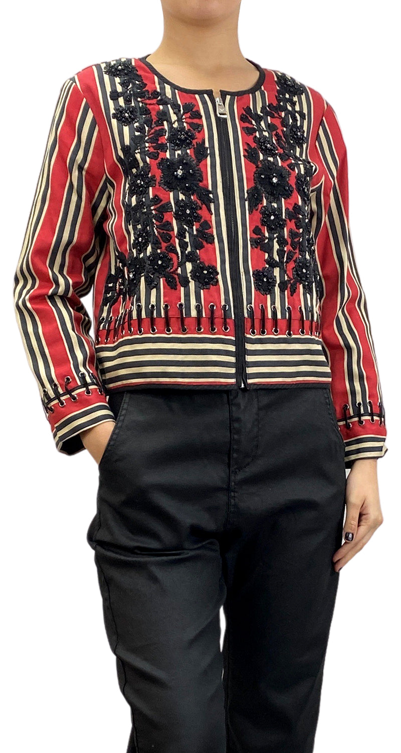 Saco a rayas en color Terracota, Negro y Beige, con estampado bordado en Negro y aplicaciones Negras y brillantes, cierre frontal.