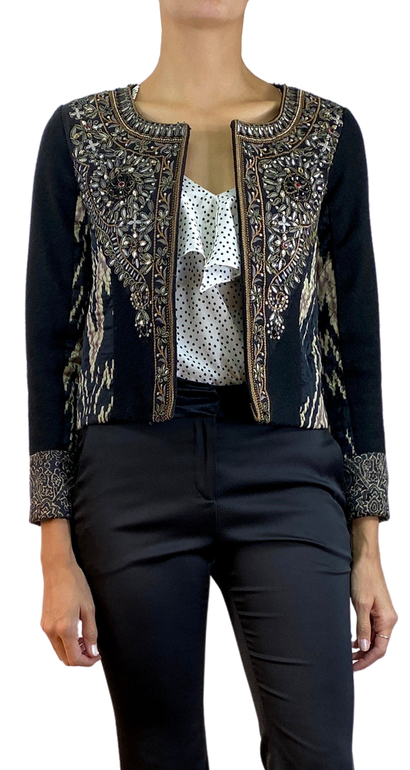 Chaqueta Bordada con estampado multicolor, broche en cuello y mostacillas decorativas.