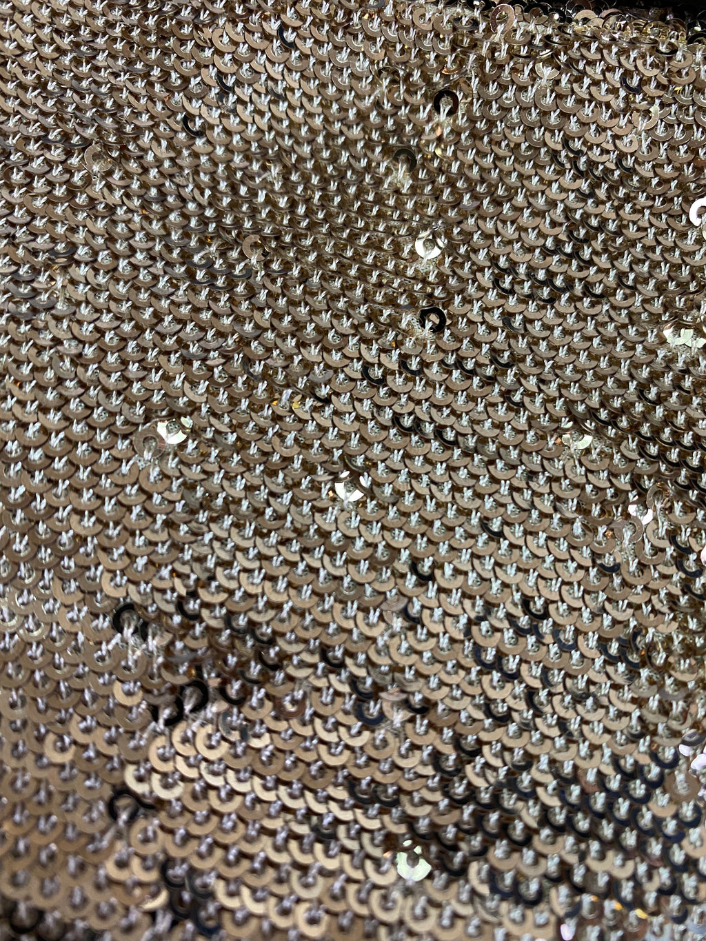 Blazer de lentejuelas en color Dorado, detalles en bolsillos y cuello eco cuero. Manga larga. Talla M