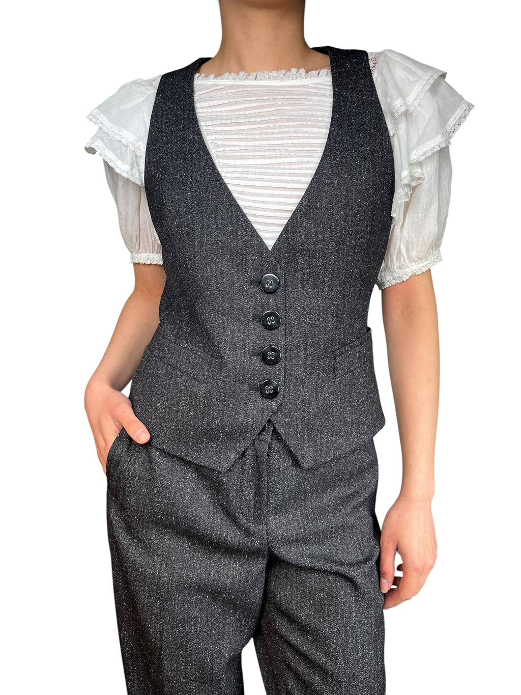 Altura modelo 1,62 cm. Tallas: Pantalón y Gilet 34, blazer 32.