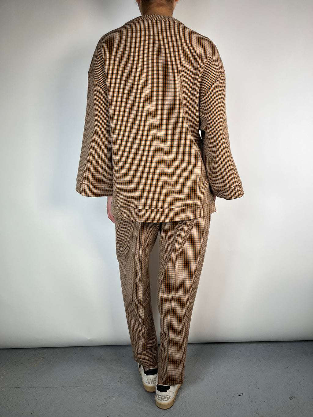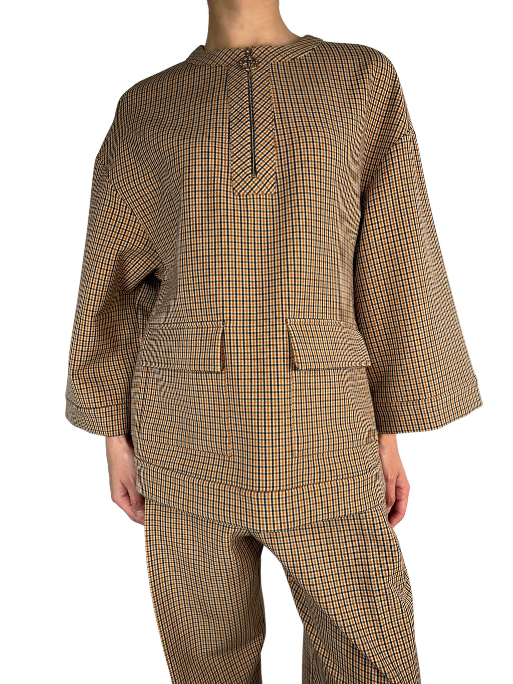 Altura de modelo 1,68. Tallas: pantalón 38, polerón M.