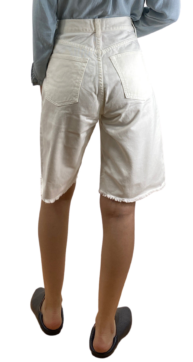 Shorts Denim Blanco con 5 bolsillos y ruedos desflecados, cierre y botón frontal. Altura de modelo 1,68