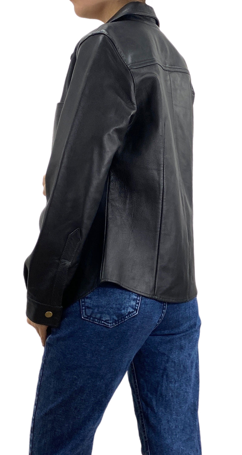 Sobrecamisa color Negro de cuero con botones de broche a presión y bolsillo frontal.