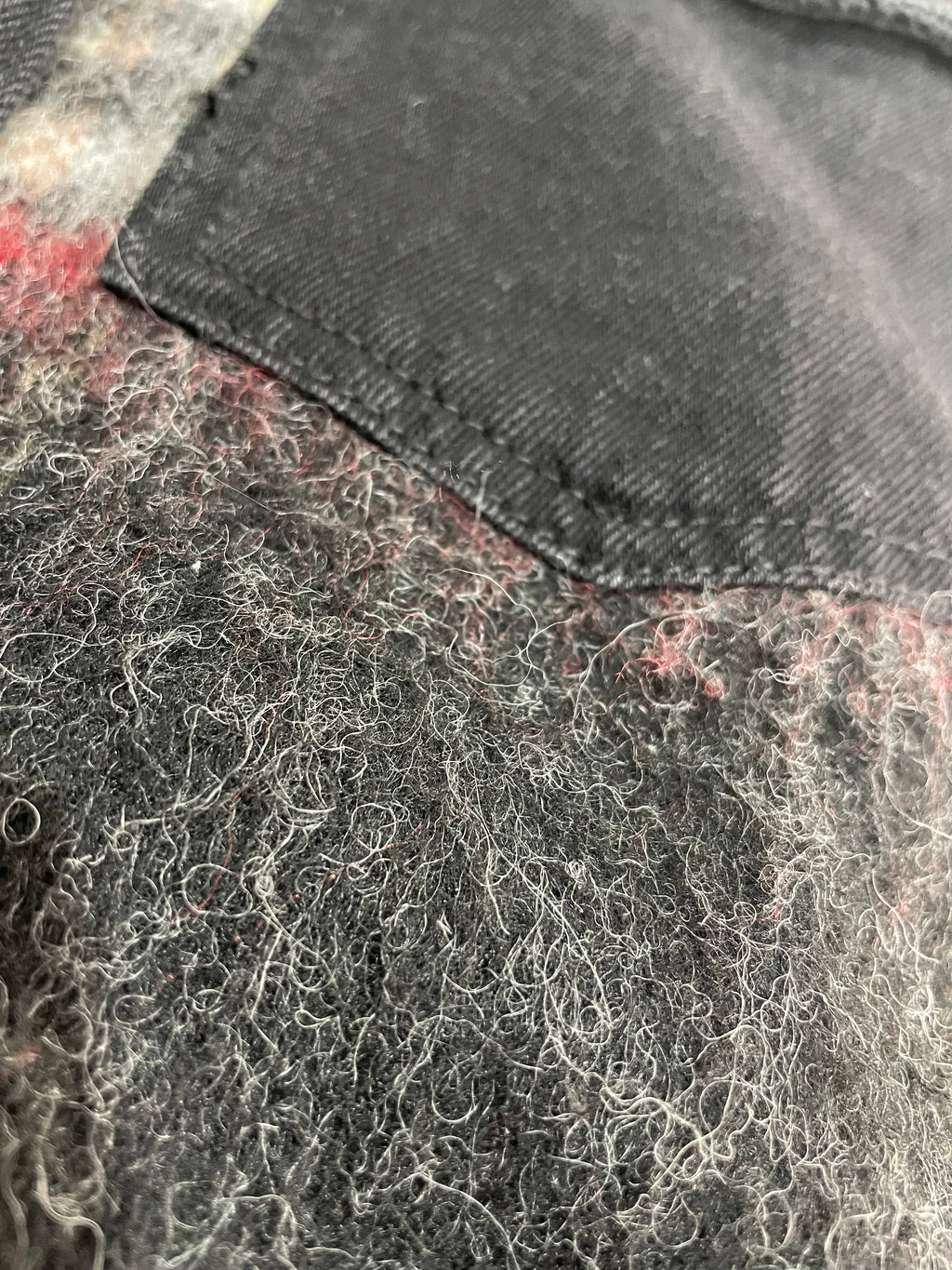 Sobrecamisa con mix de texturas, dos bolsillos y botones a presión en delantero, desflecado en borde inferior.