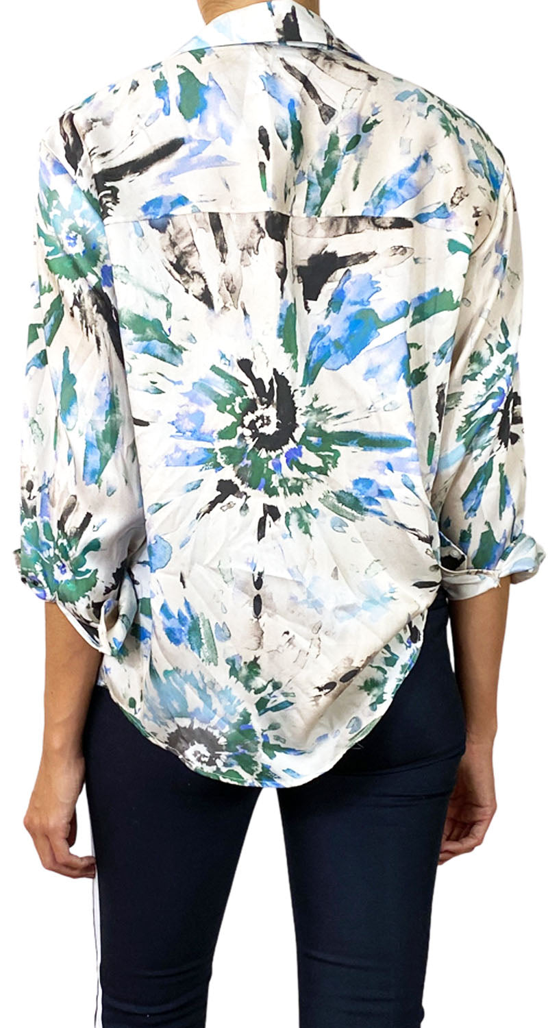 Camisa con estampado en colores frios. Cuello de solapa con cierre frontal de botones.