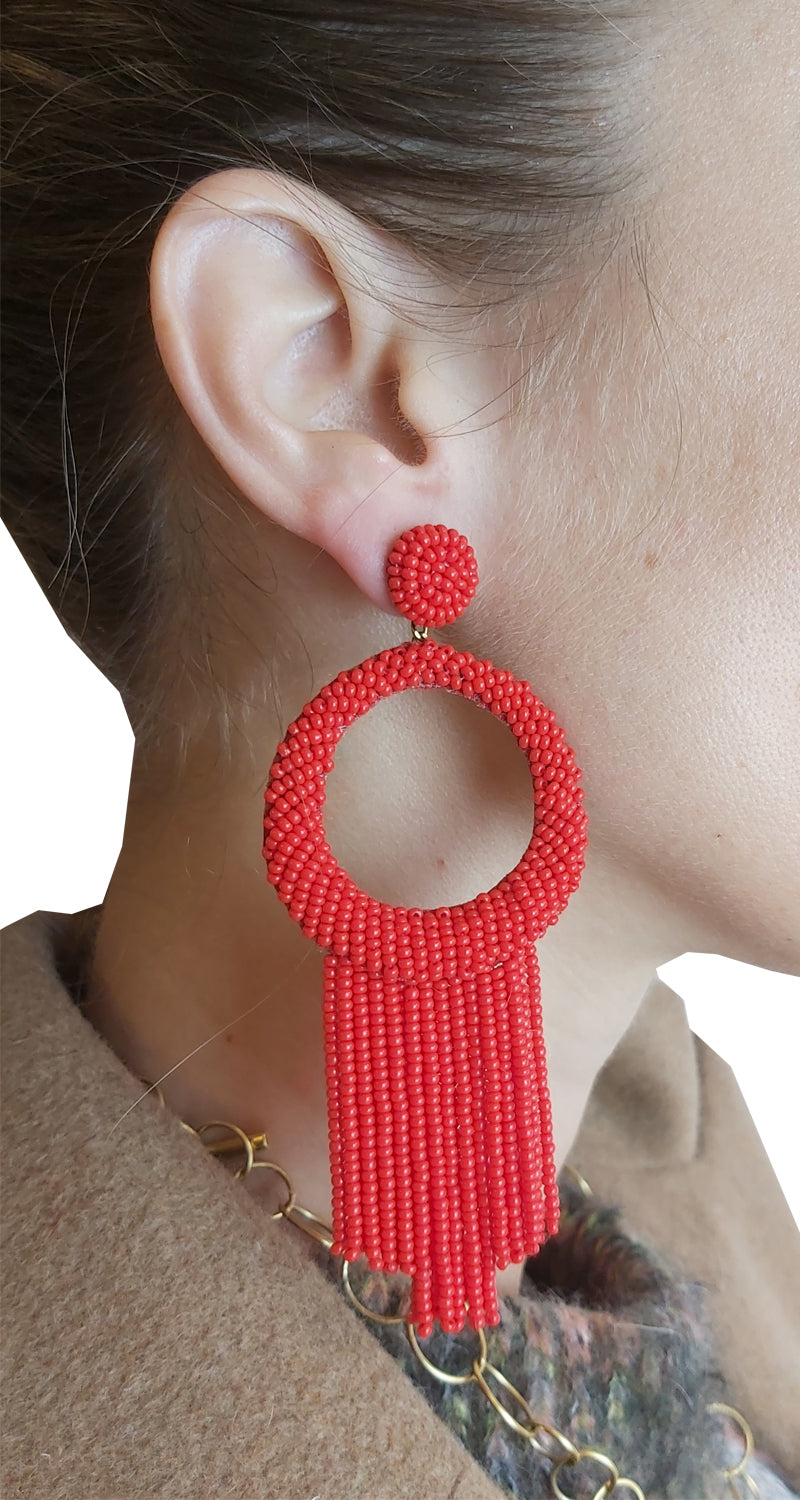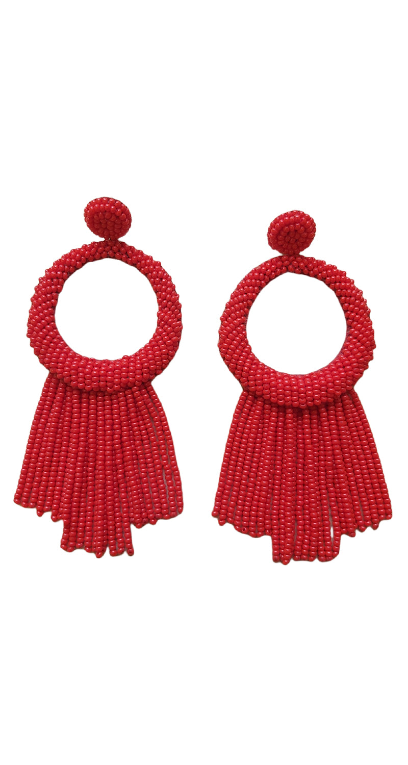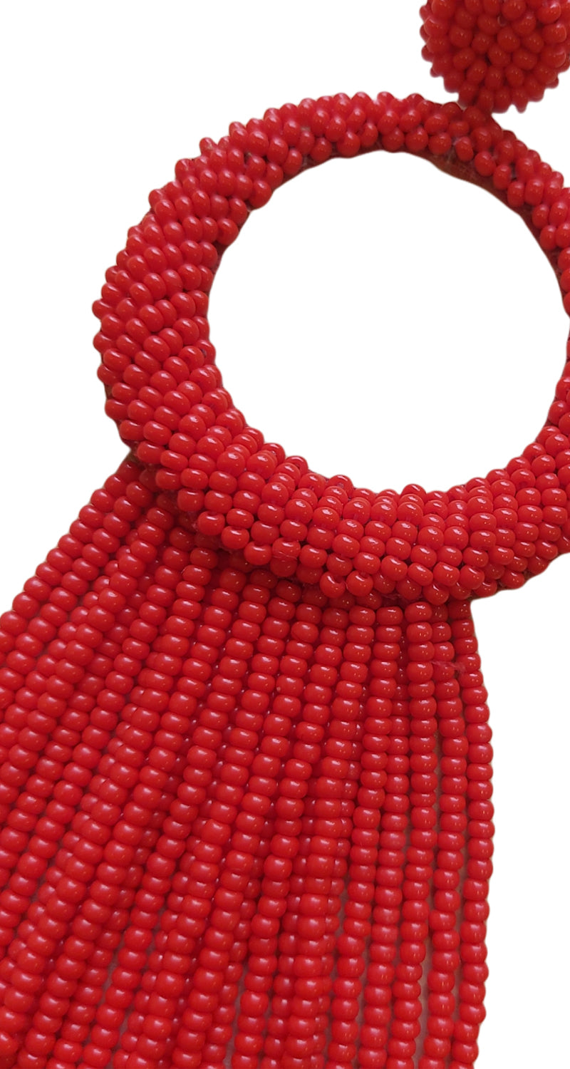 Aros pegados en forma circular con mostacillas en color Rojo. Largo: 11 cm.