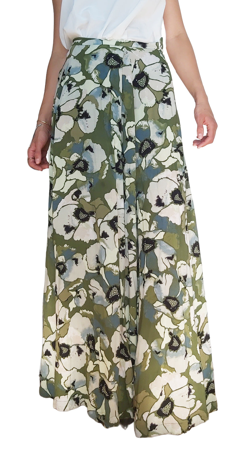 Maxi Falda estampada en tonos Verde. Tiene abertura en costado.