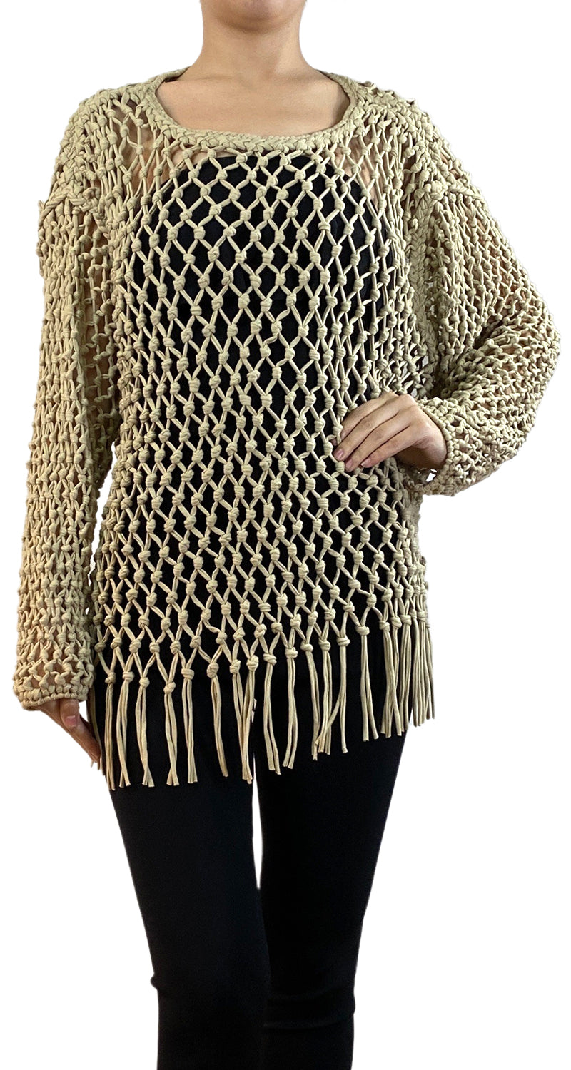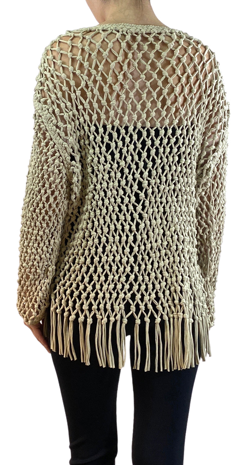 Sweater con tejido súper abierto de puntos hechos con nudos. Tiene escote redondo, mangas 7/8 y terminación de flecos. El calce es recto y el largo es por la segunda cadera.