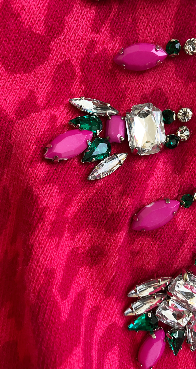 Sweater Animal Print en Fucsia, botones con diseño, cuello redondo con aplicaciones.