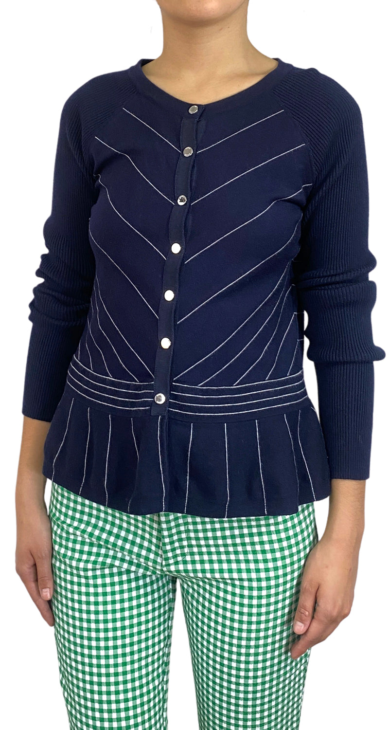 Sweater color Azul con diseño a rayas, botones en delantero y mangas fruncidas.