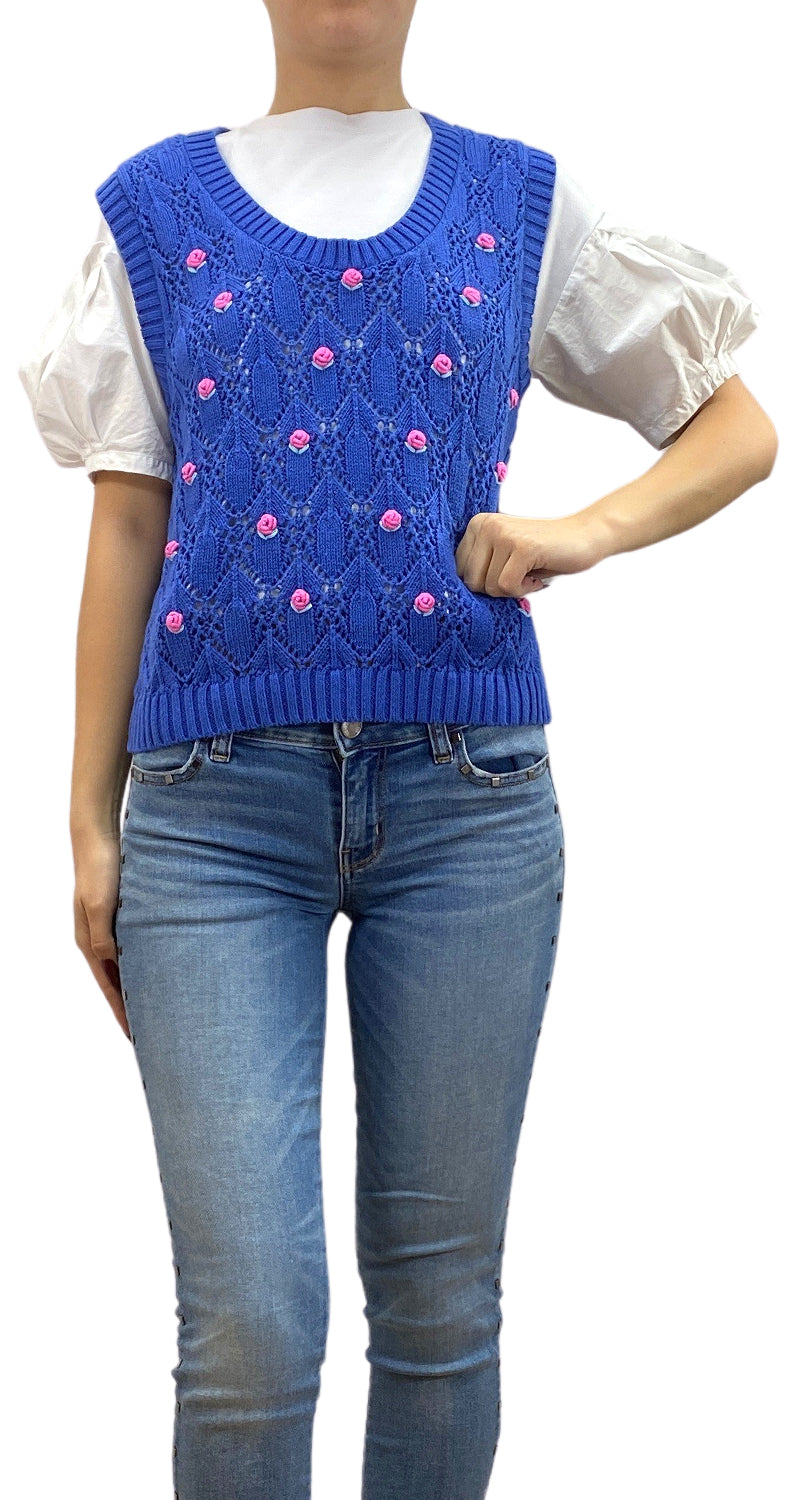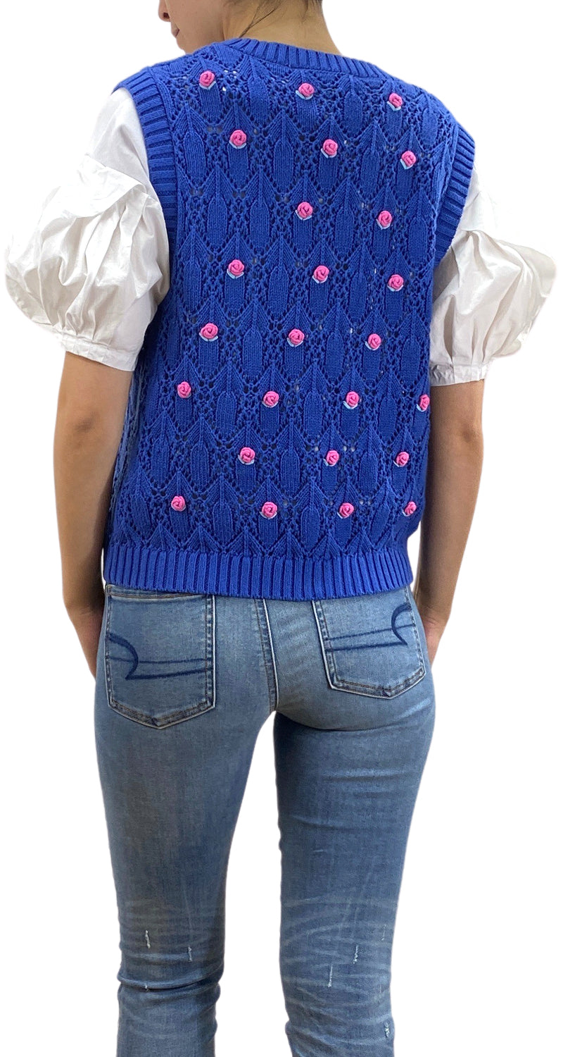 Sweater sin mangas color Azul con bordado de flores rosadas.