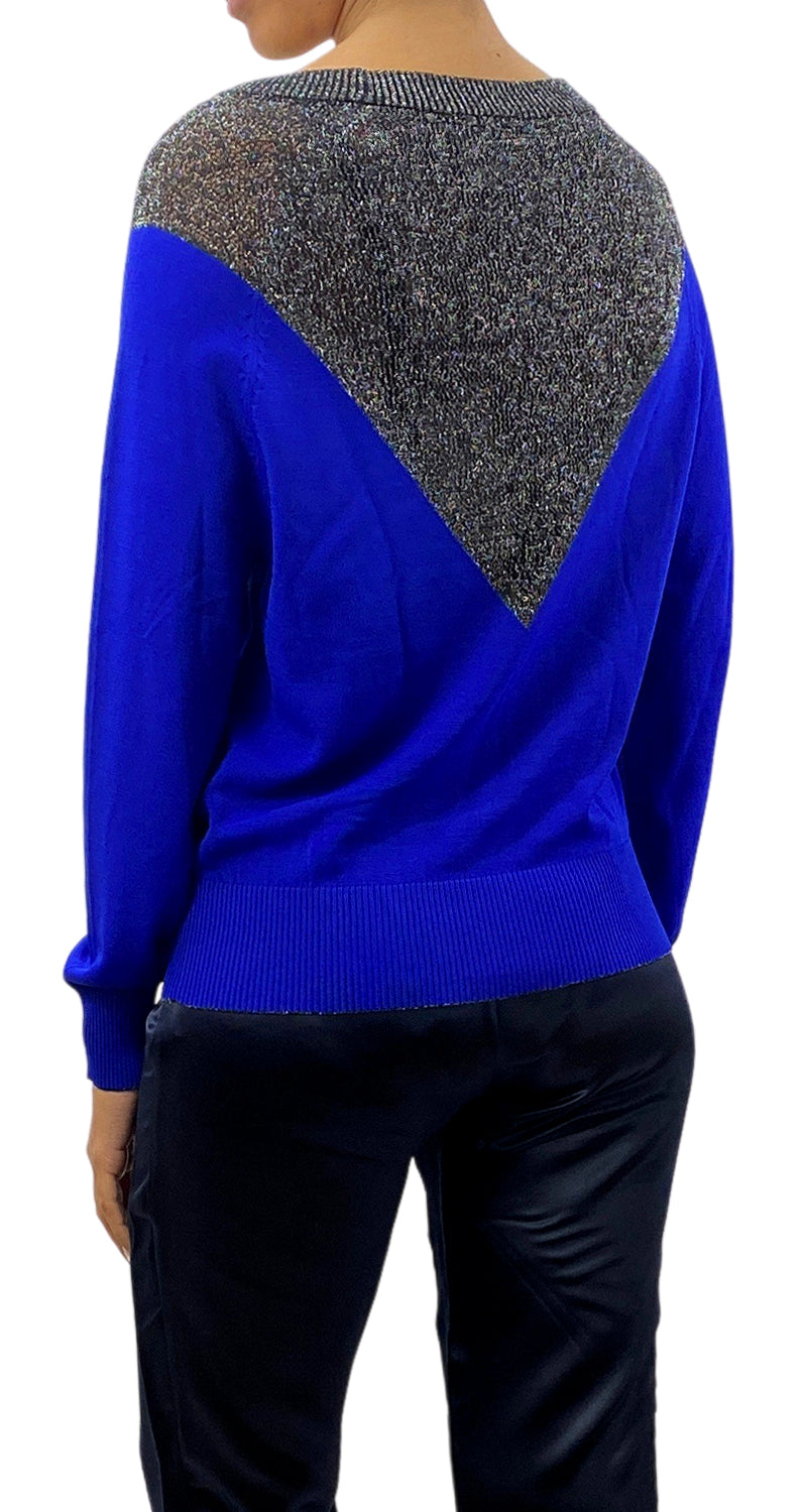 Sweater color Azul, de cuello redondo con diseño de tejido Gris y fibras metalizadas.