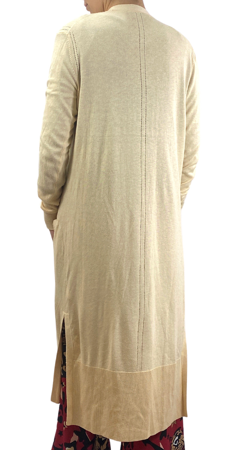 Sweater largo abierto estilo cárdigan con dos bolsillos frontales y abertura laterales. Altura de modelo 1,68