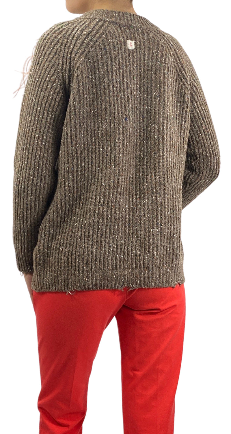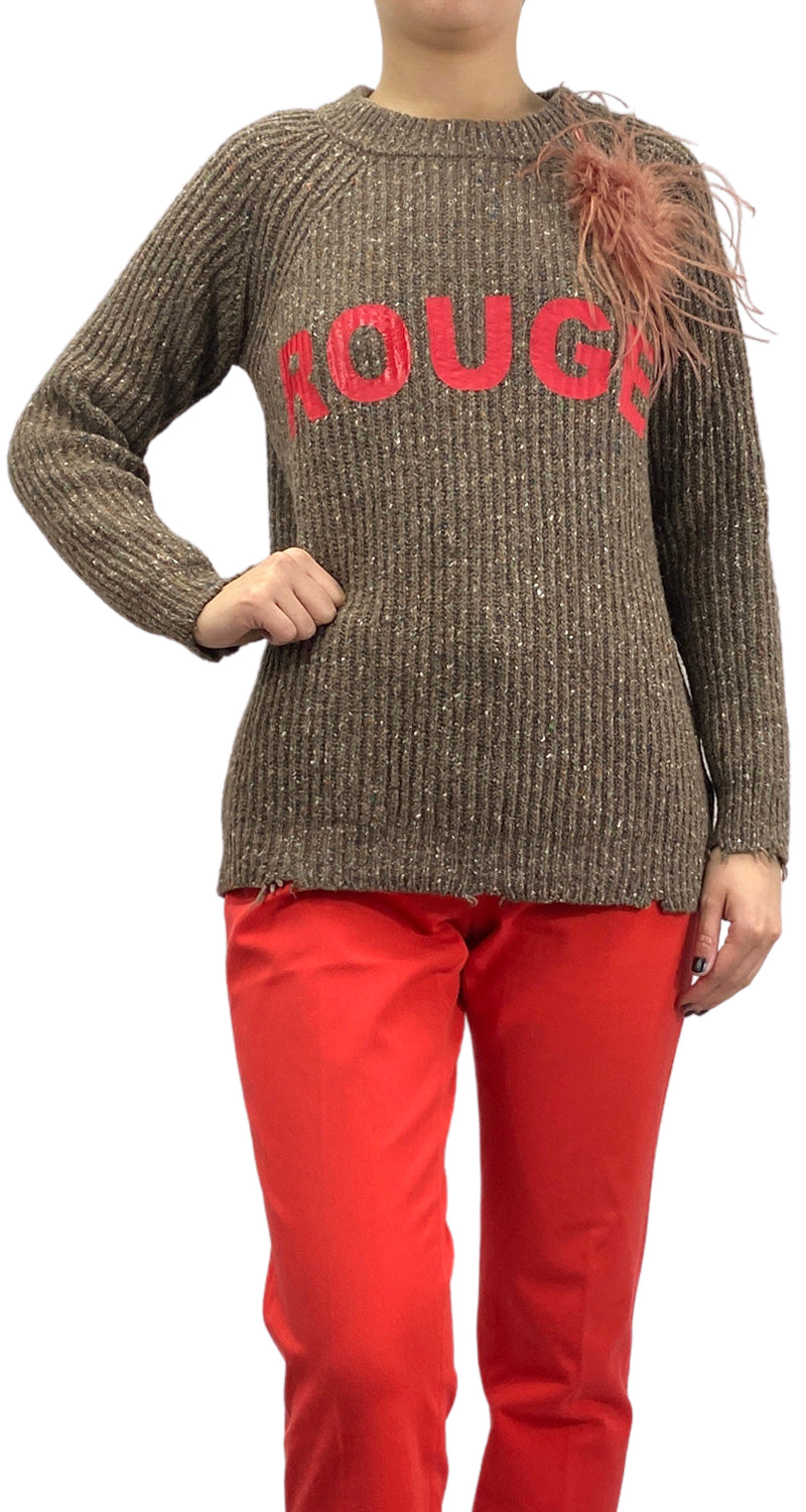 Sweater cerrado cuello redondo color Café con estampado frontal y broche de plumas. Marca Guardaroba.