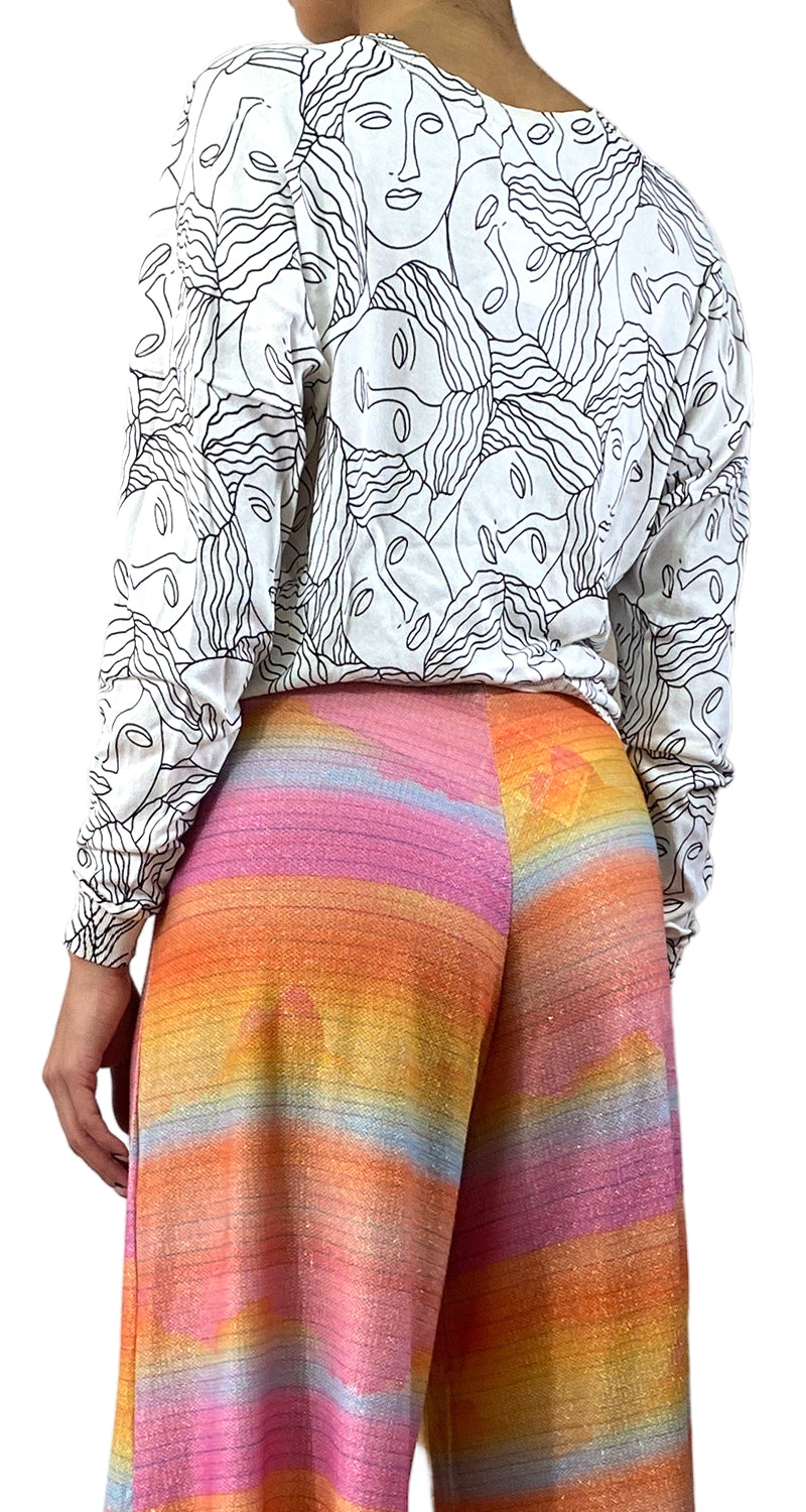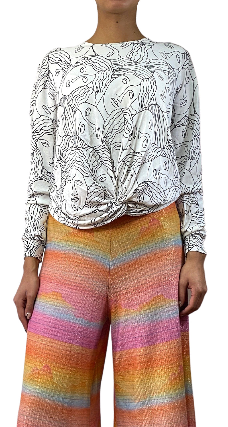 Sweater color Blanco con estampado de caras en Negro, nudo en delantero.
