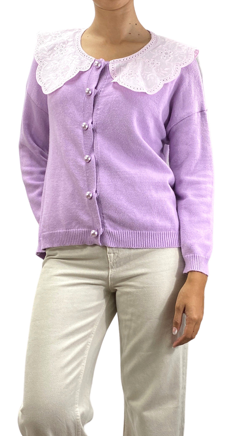 Sweater tejido de cuello bobo con diseño bordado color Morado, cierra con botones a presión, aplicaciones de perlas en delantero.
