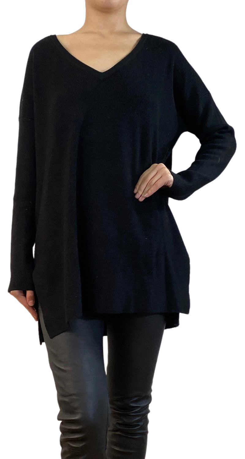 Sweater largo tejido en color Negro de cuello V, aberturas en laterales. Talla U de la marca.