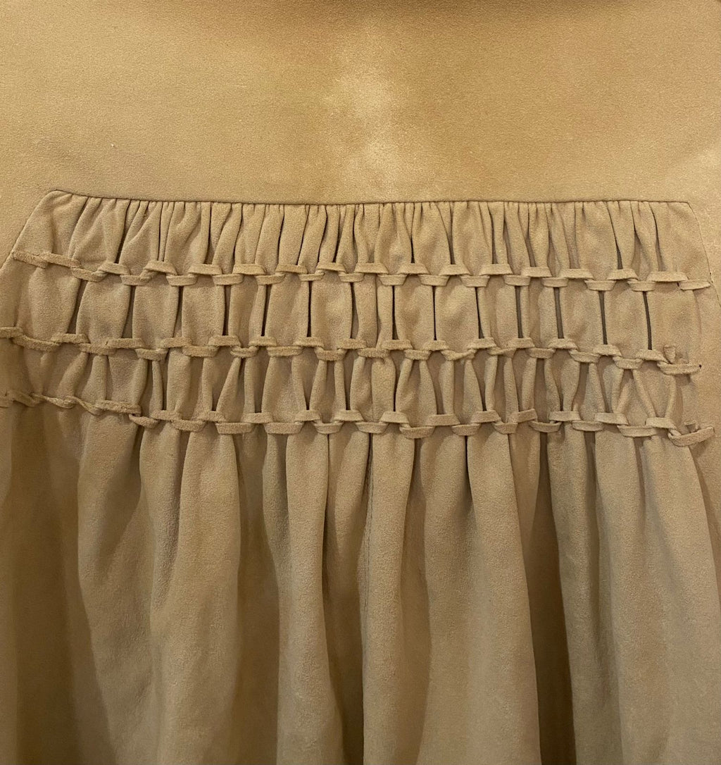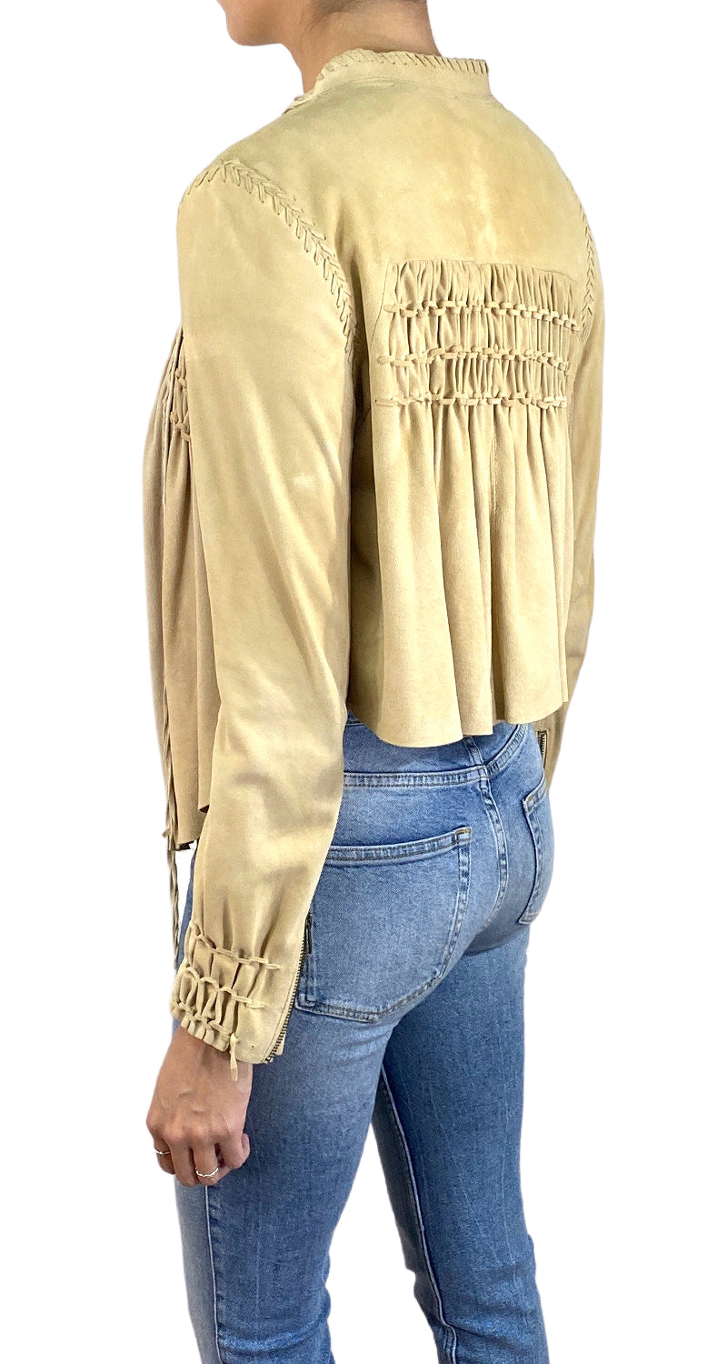 Chaqueta Beige de gamuza con detalles fruncidos, y tejidos. Presenta color irregular en gamuza.