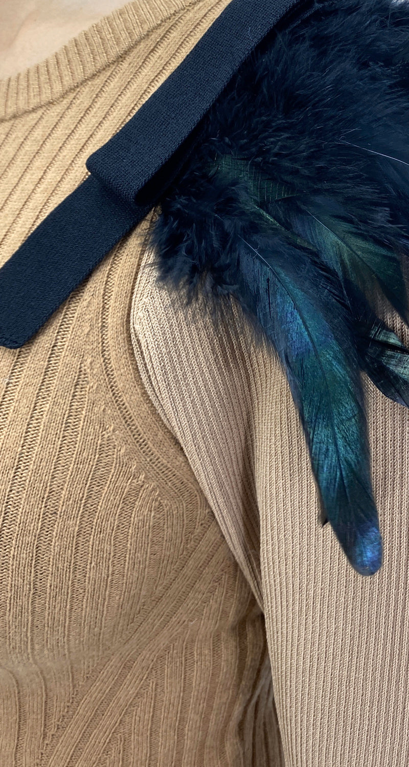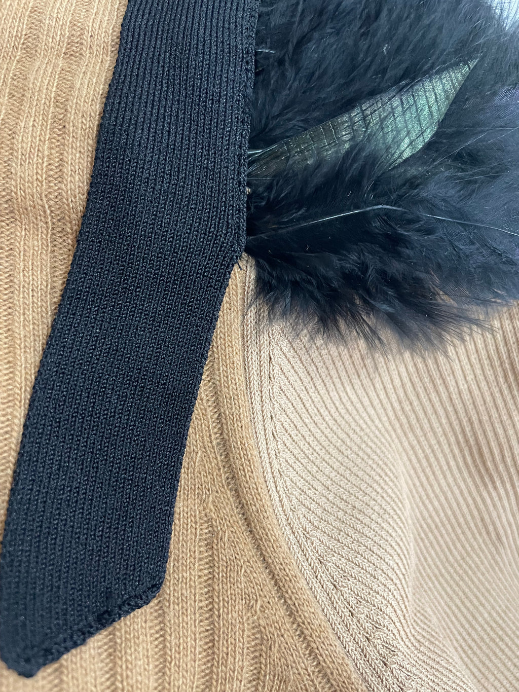 Sweater tejido en color Café, mangas fruncidas y plumas Negras en hombros. Talla 1 de la marca.