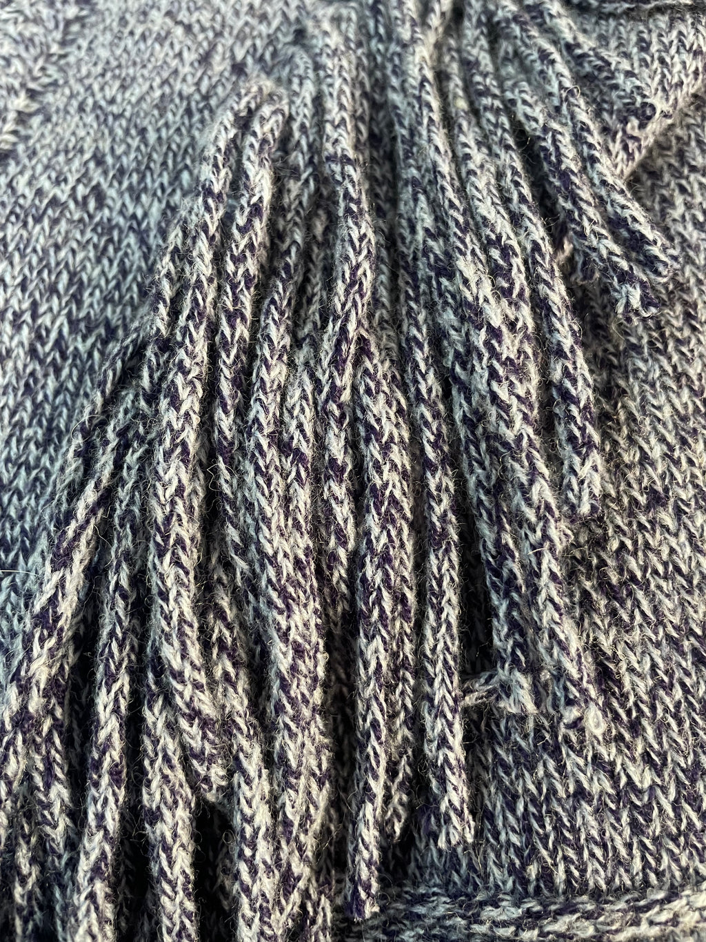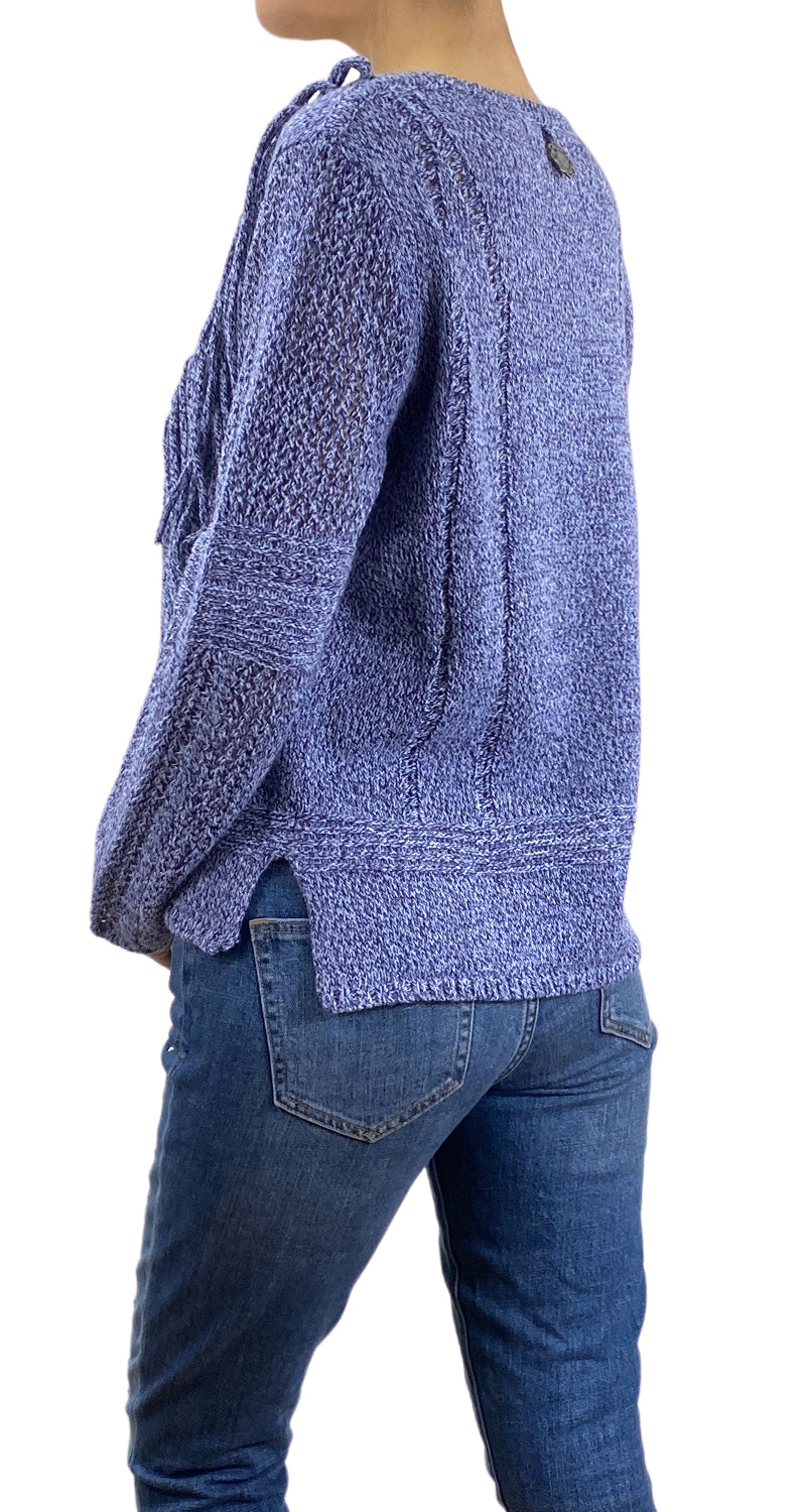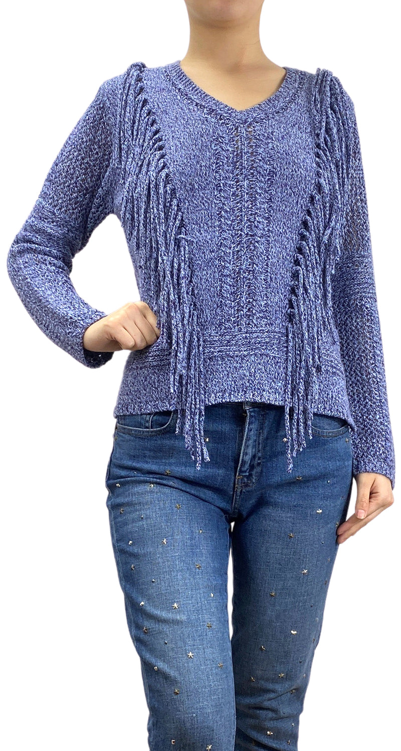 Sweater Azul tejido con cuello en V y flecos en delantero.