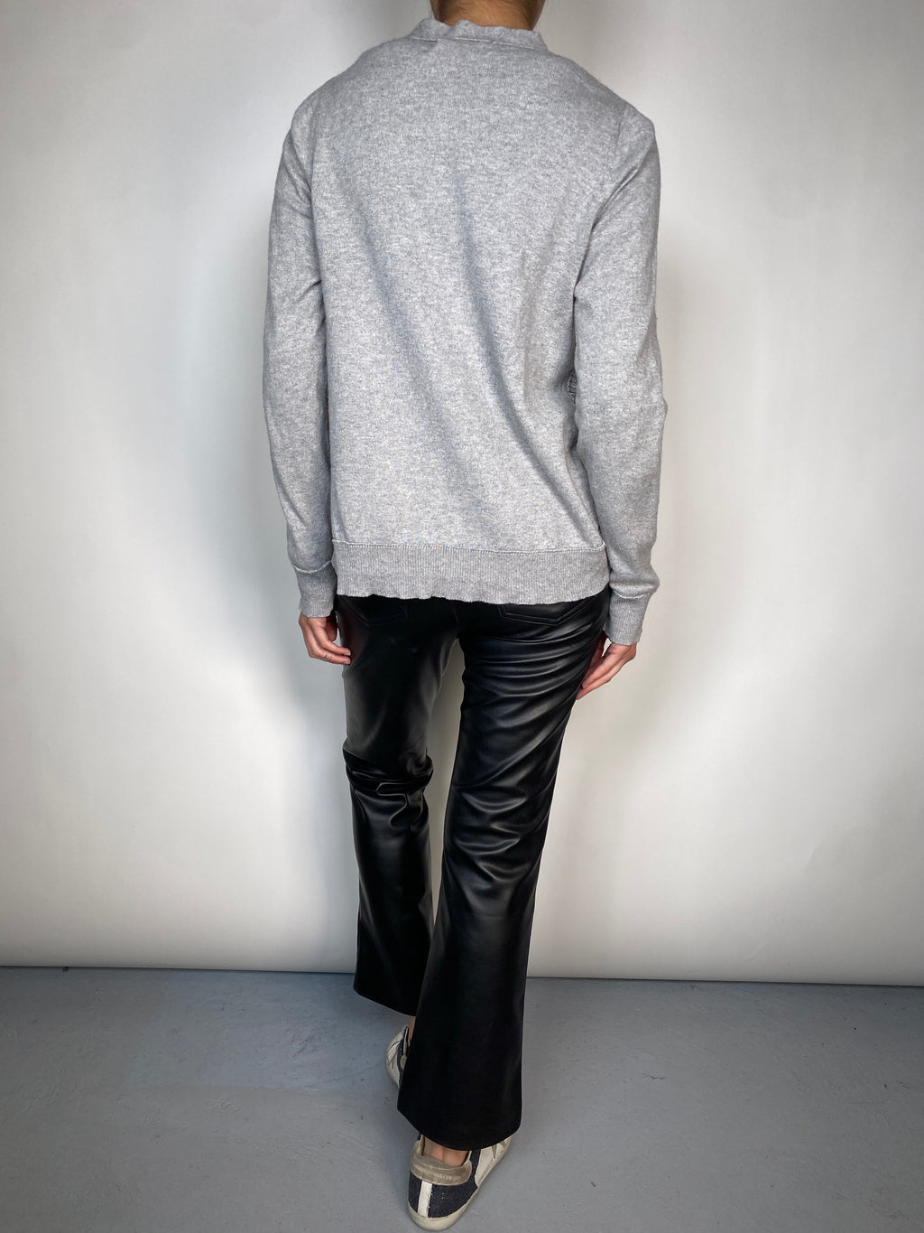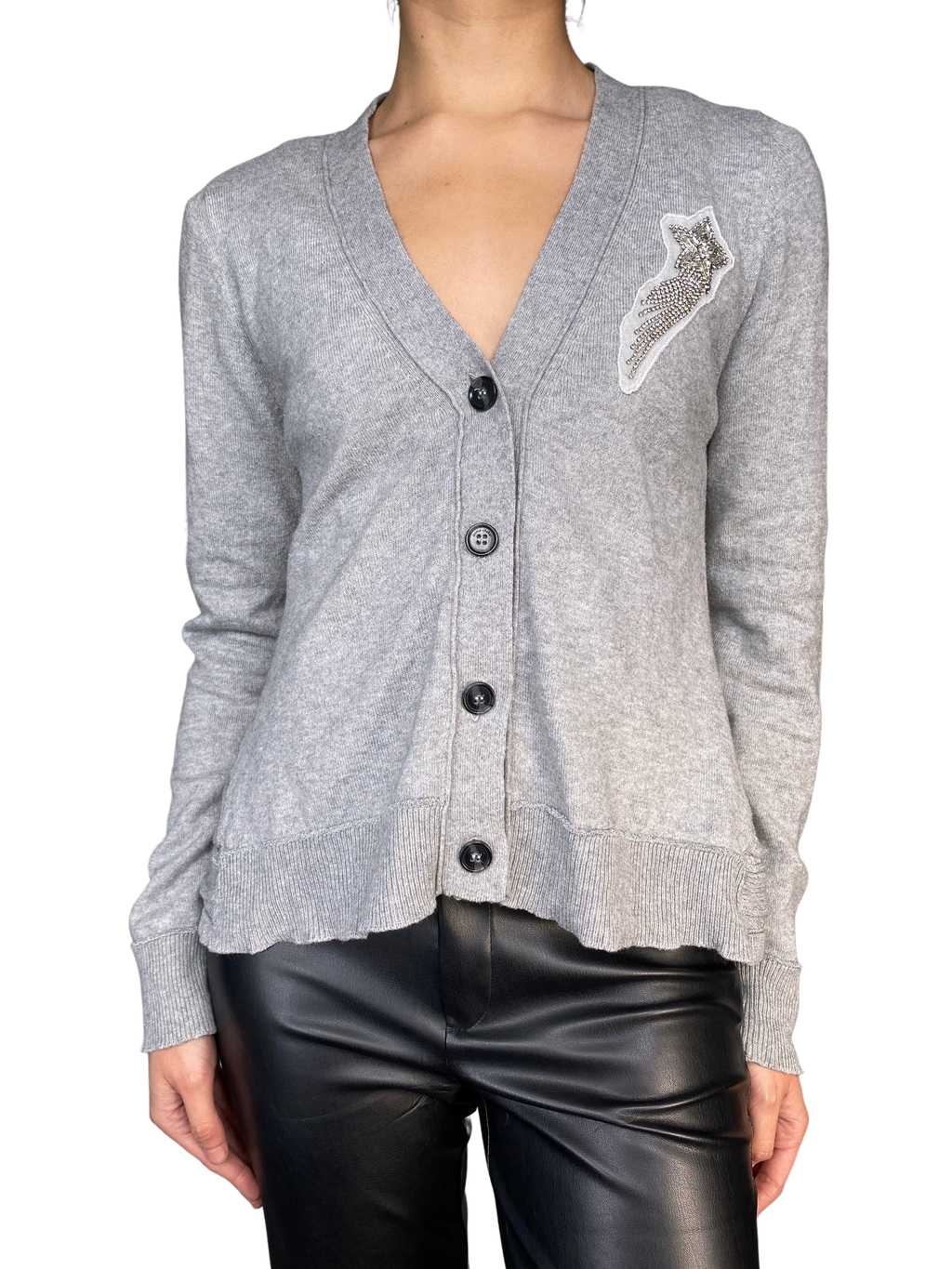 Sweater estilo cárdigan en color Gris, botones y aplicaciones con brillantes en delantero, en lateras diseño con hilos metalizados. Talla 3 de la marca.
