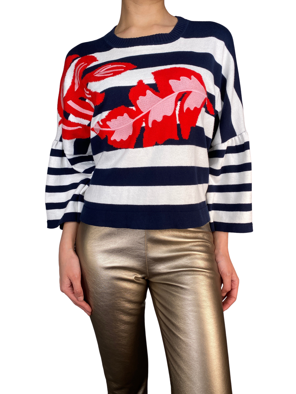 Sweater a rayas en color Azul Marino y Blanco, con estampado bordado de hojas Rojo y Rosado, mangas 3/4 acampanadas. Talla 2 de la marca.