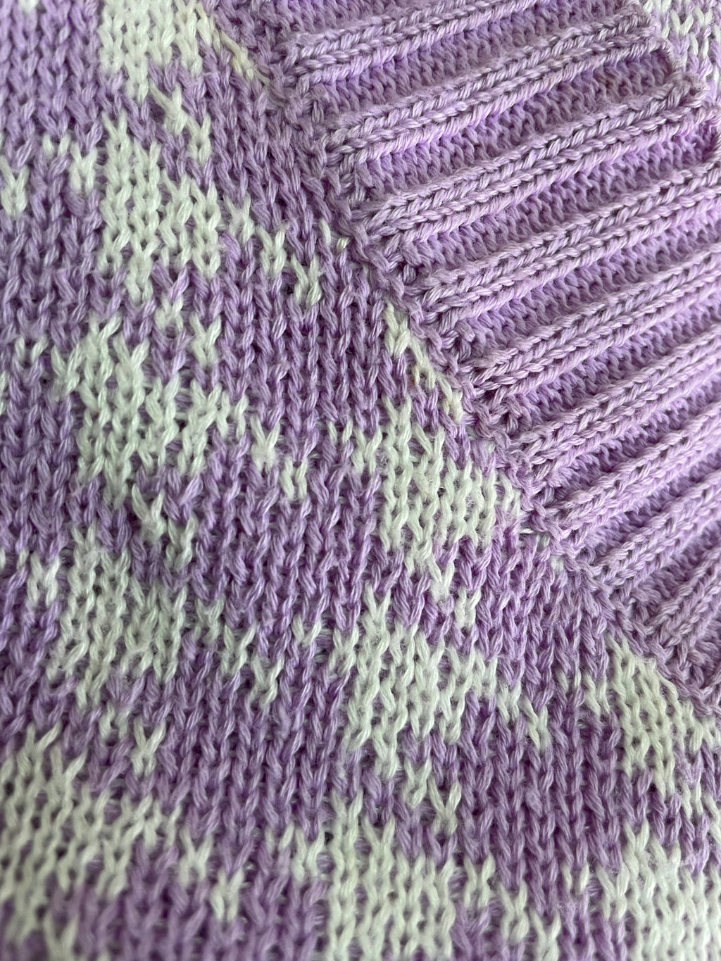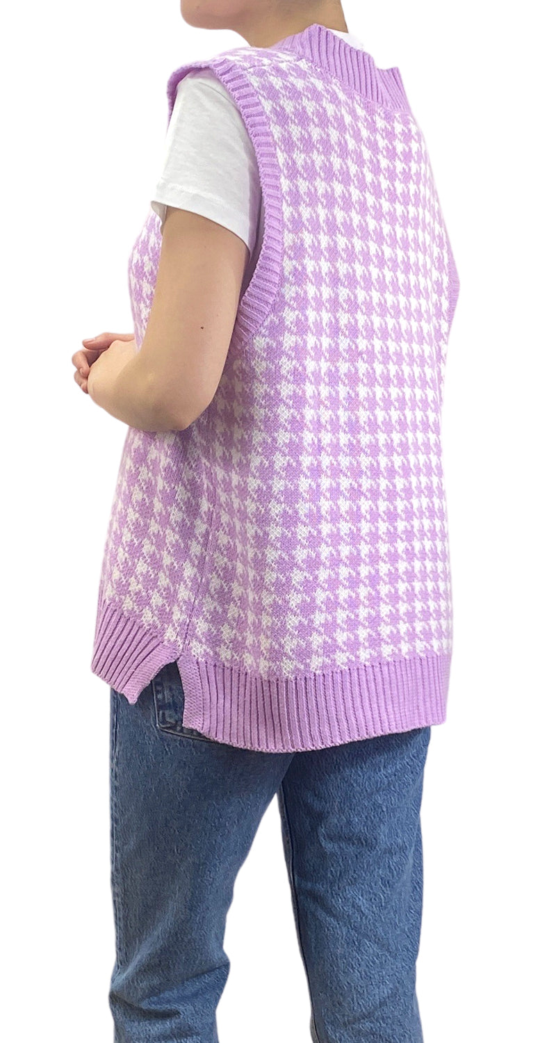 Sweater tejido sin mangas con estampado houndstooth en color Morado y Blanco, cuello V. No especifica talla.