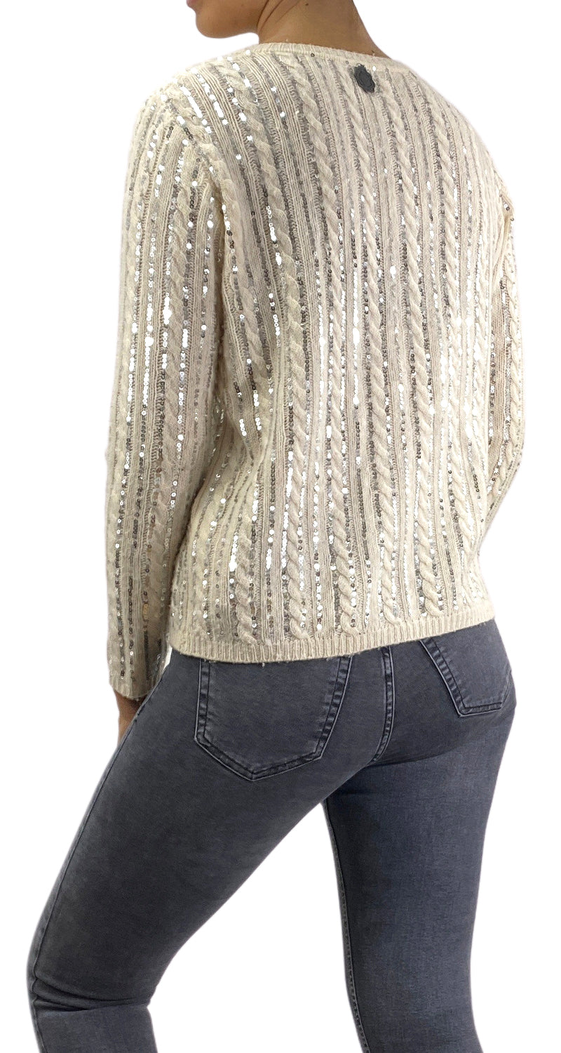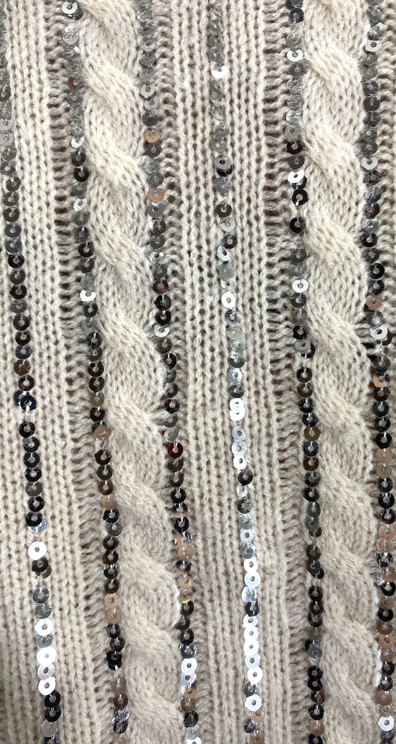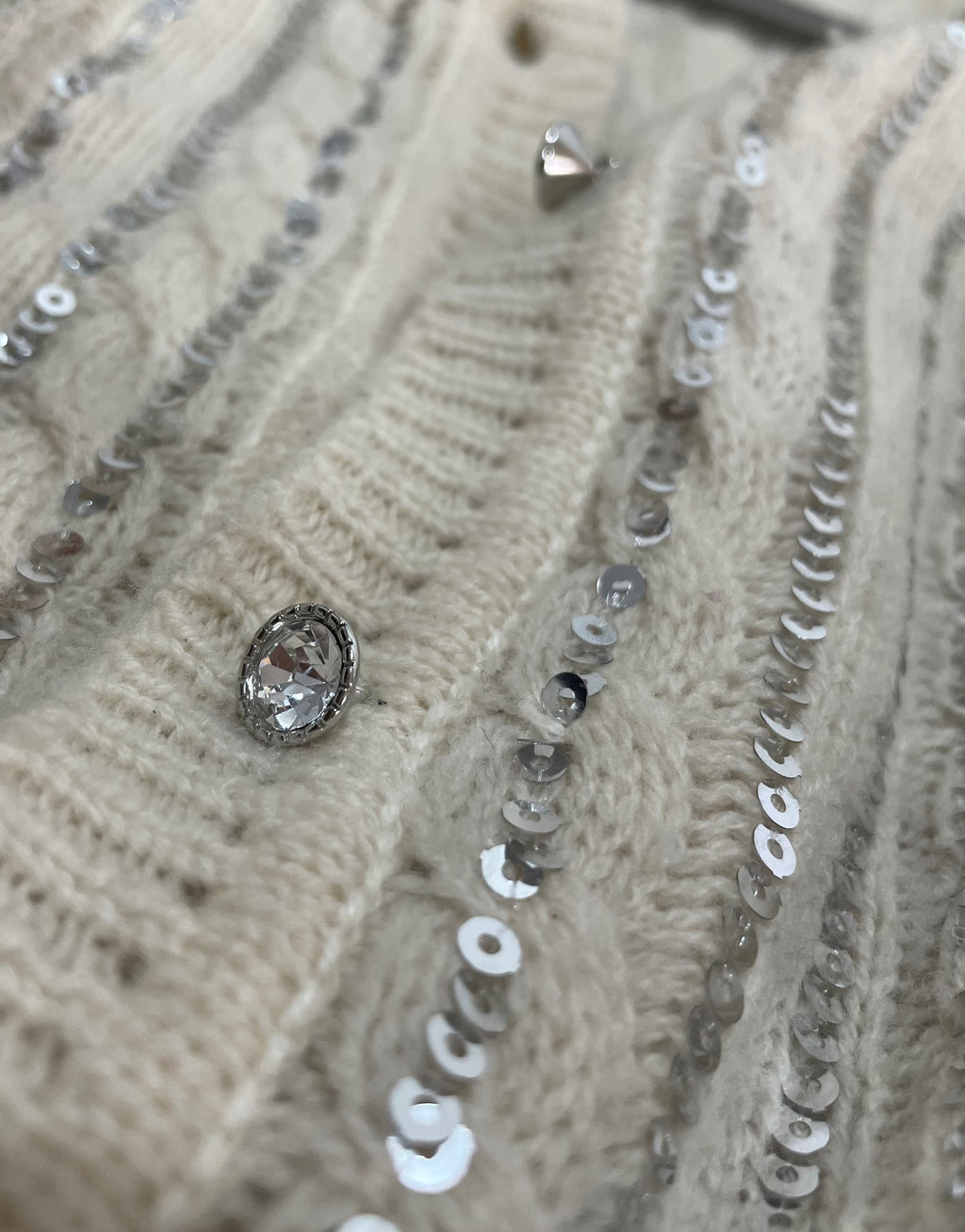 Sweater tejido en color Beige con lentejuelas Plateadas, botones con brillantes en delantero.