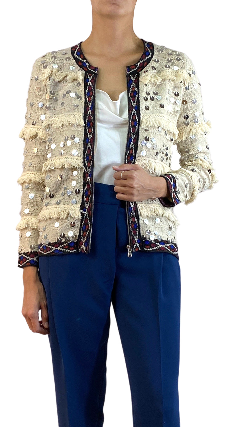 Sweater color Beige con zipper, diseño de lentejuelas y flecos.