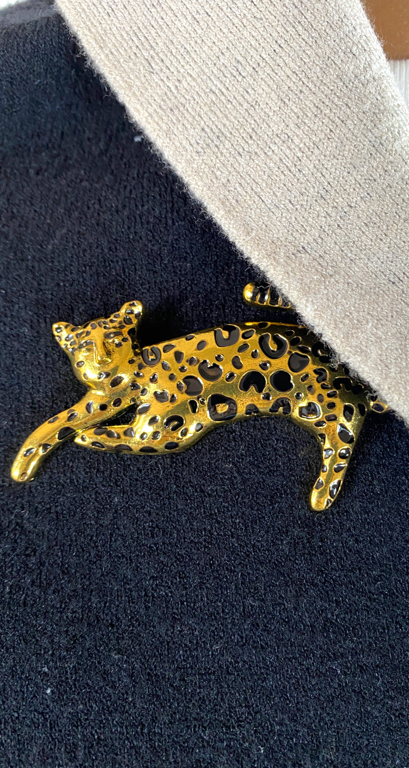 Sweater color Negro abierto detalle de flecos, con prendedor de Leopardo.