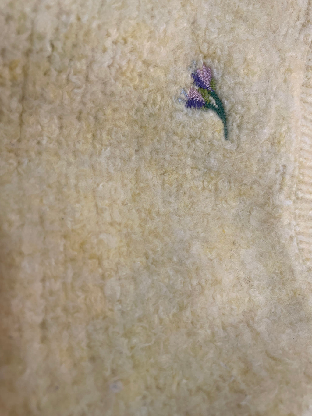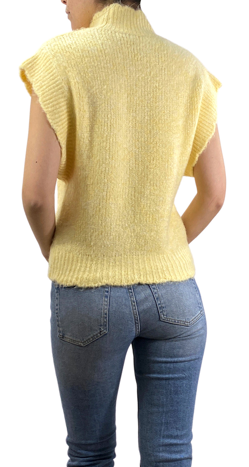 Sweater tejido sin mangas color Amarillo con estampado de flores bordadas, cuello alto.