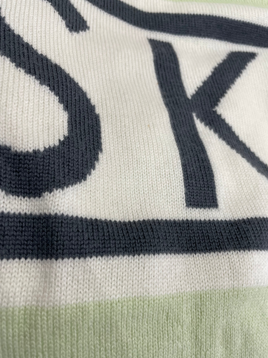 Sweater tejido cuello tortuga en color Verde con franja Blanca en centro y mangas, estampado "SKI" en Gris.