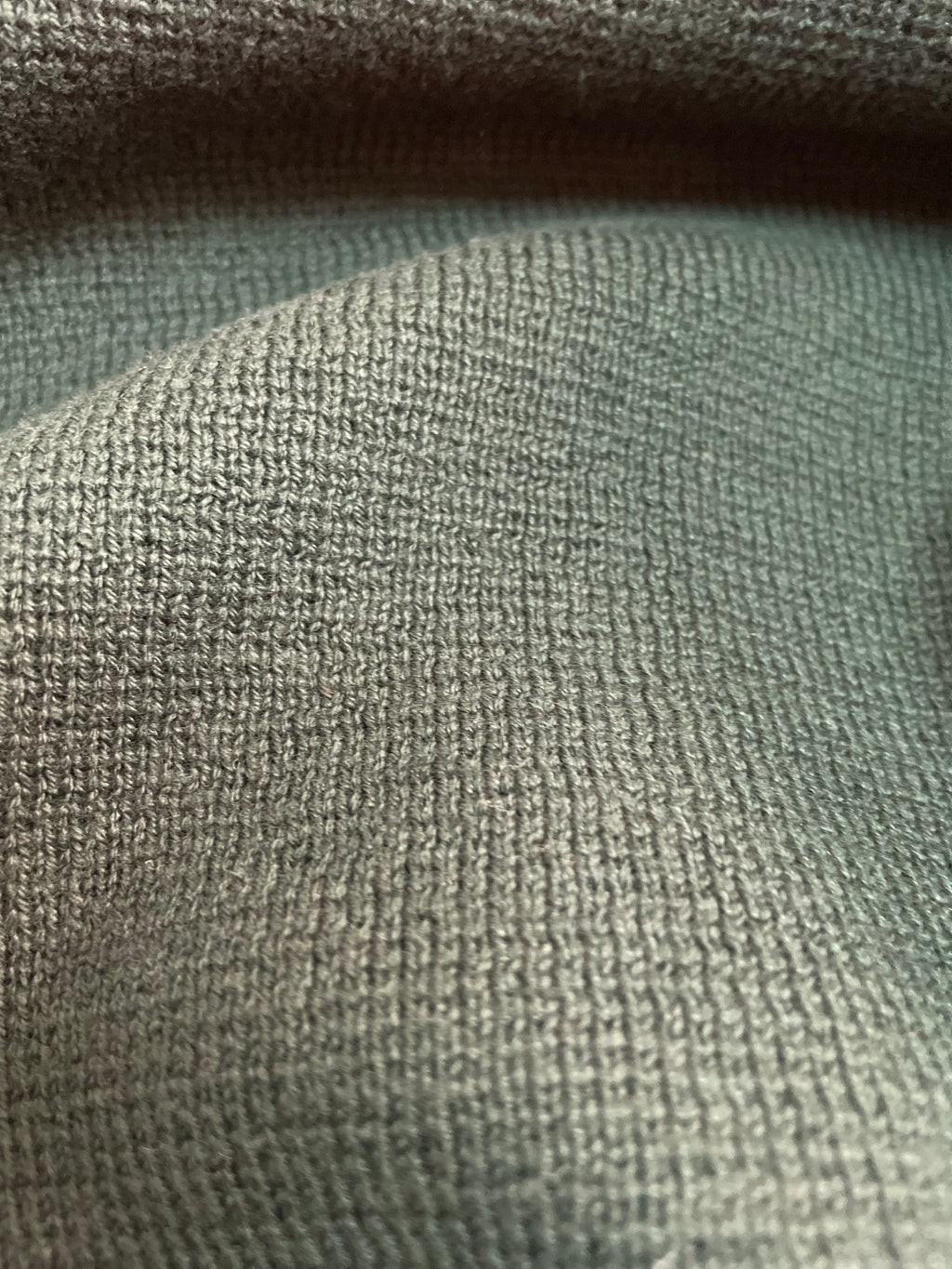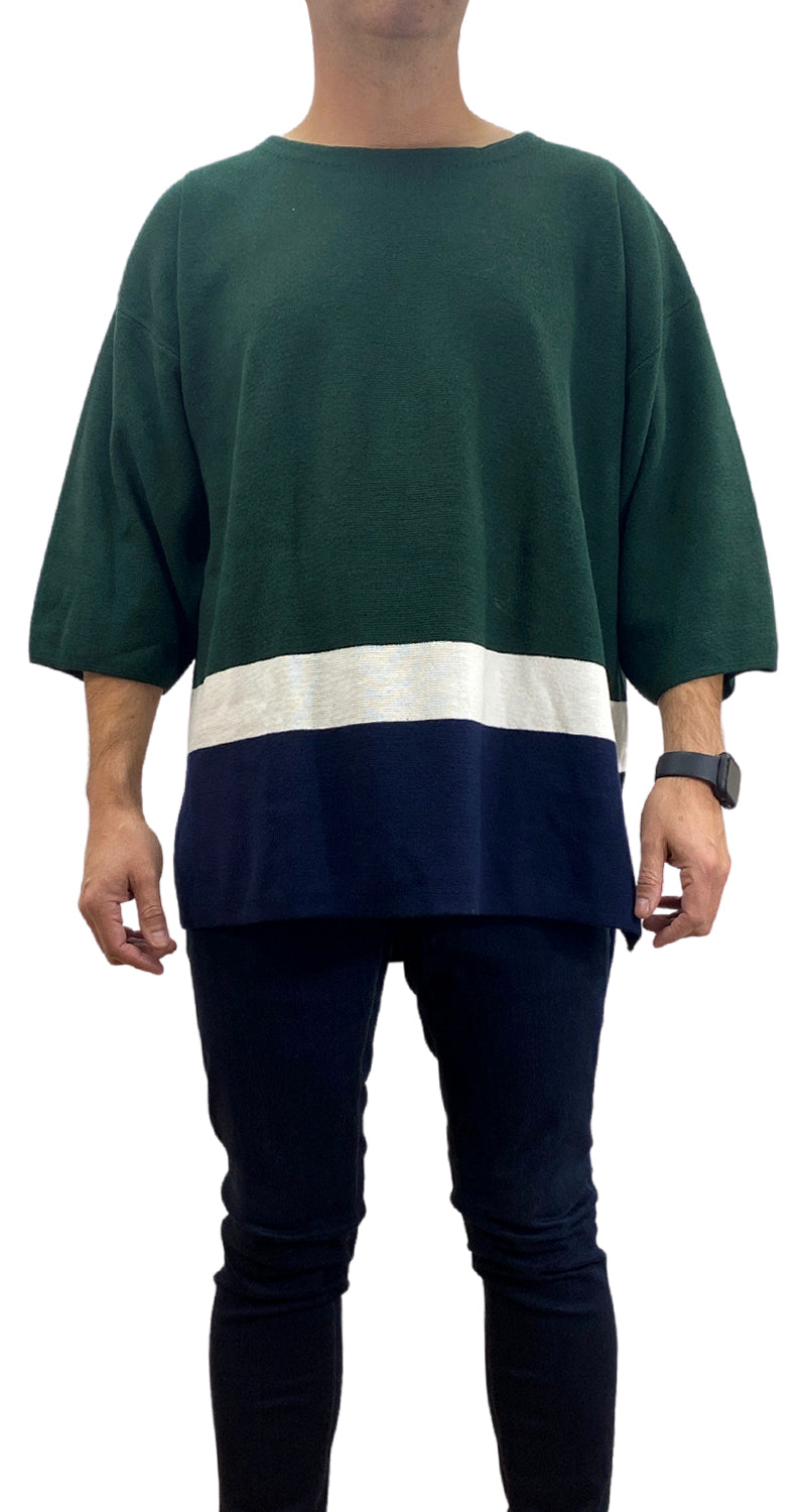 Sweater color Verde cerrado con diseño de aberturas laterales y de franjas en Azul y Blanco.