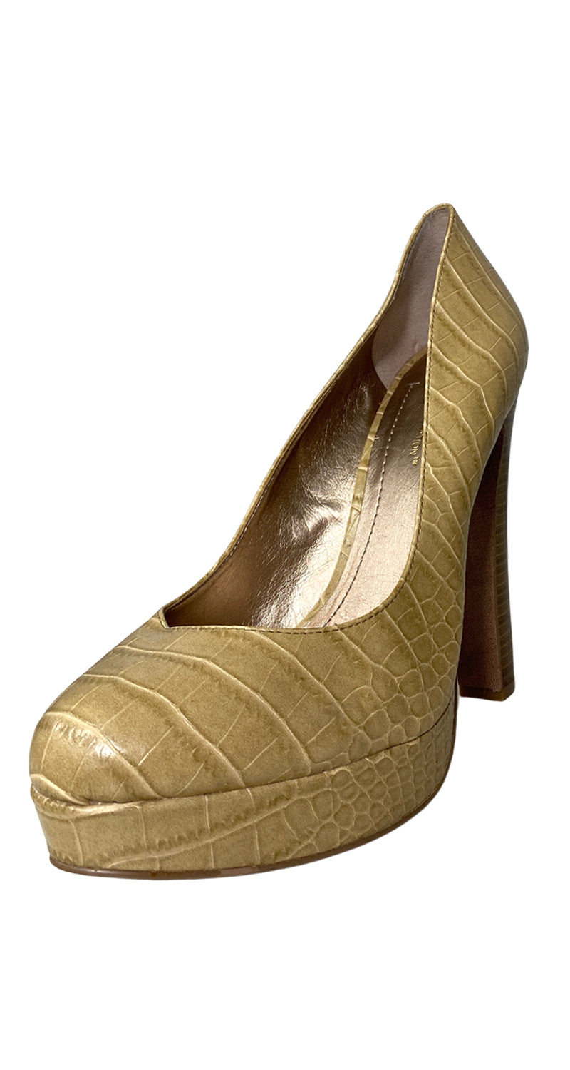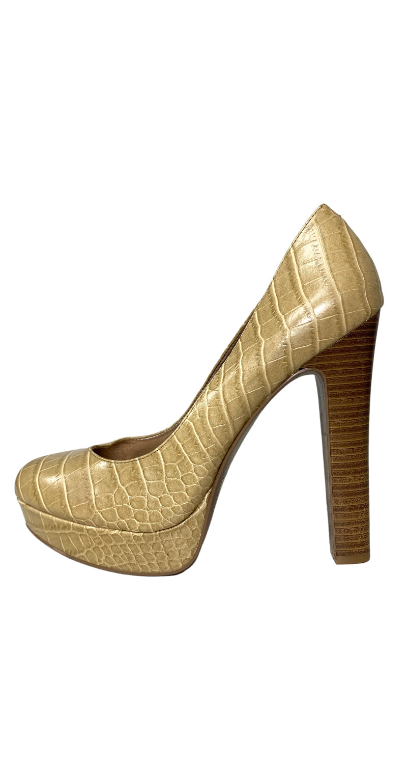 Taco alto de Ecocuero Beige con plataforma de 2,5 cm y tacón color Café de 14 cm. Las compras efectuadas de la categoría calzado, no tienen derecho a cambios ni devoluciones.