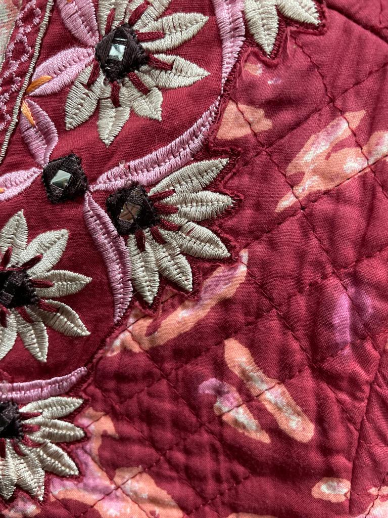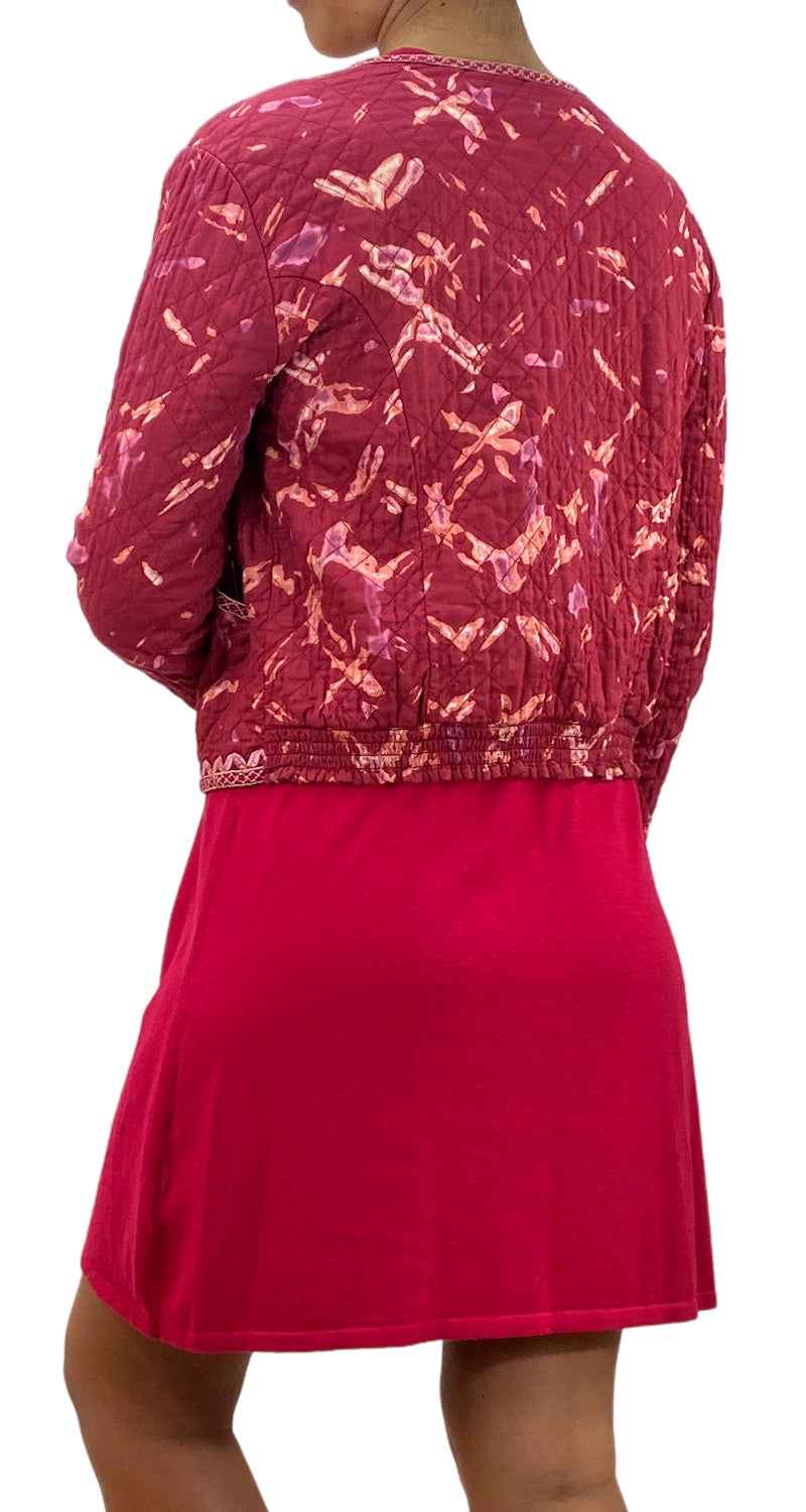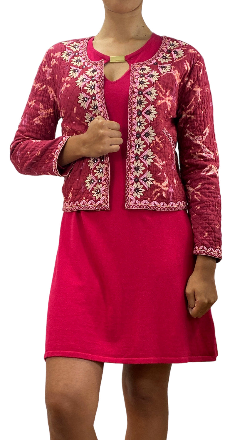 Chaqueta color Burdeo con estampado estilo tie dye, bordado de flores con detalles de espejos.
