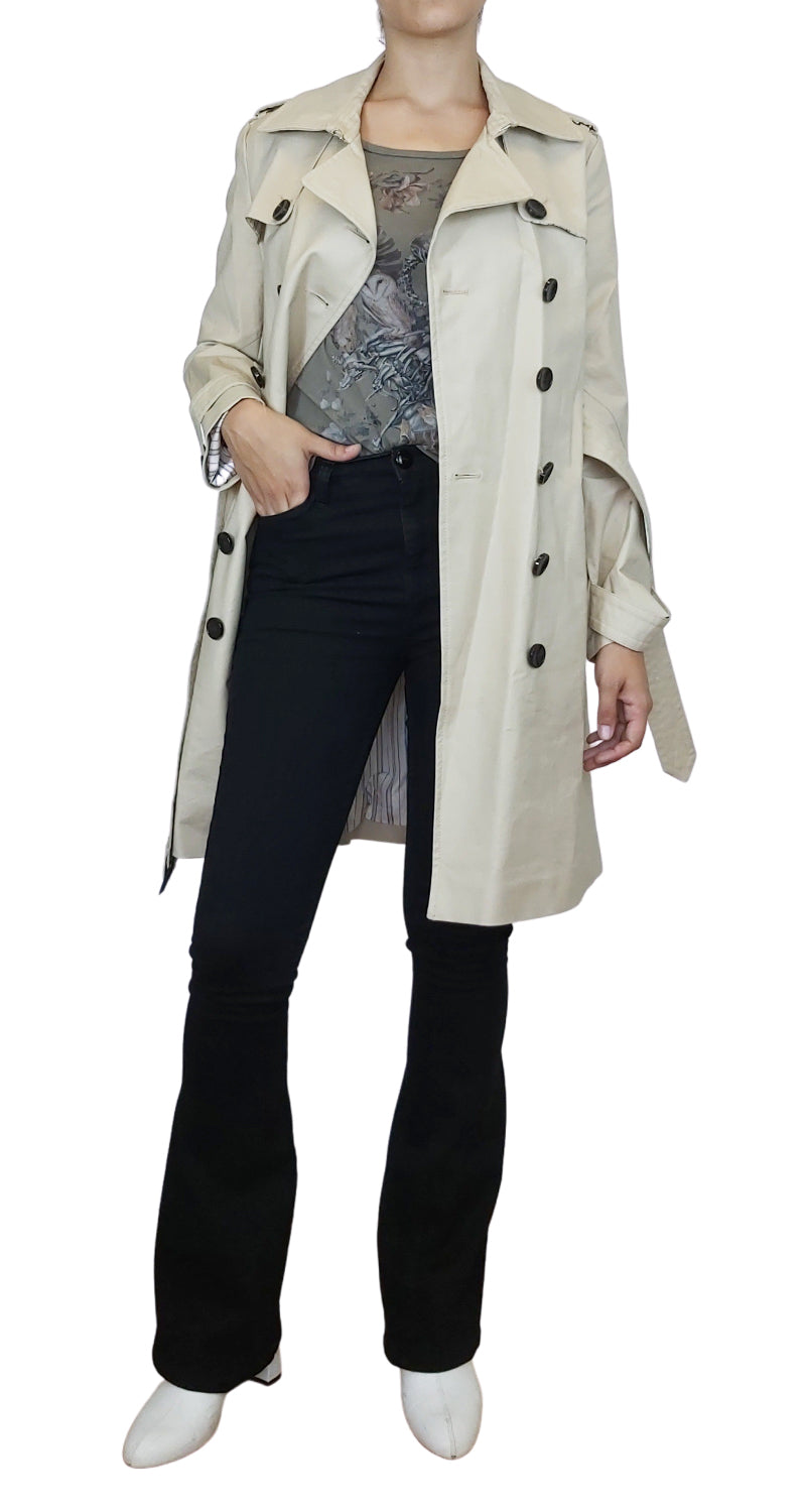 Trench color Beige con doble botonadura, con forro de líneas en tonos Blanco, Celeste y Amarillo. Leves signos de uso, manchas que desaparecen con lavado.