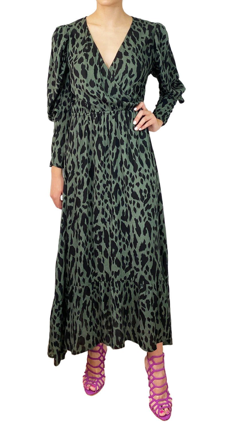 Vestido Maxi con estampado Animal Print elastico en cintura con escote en V y de mangas estilo globo