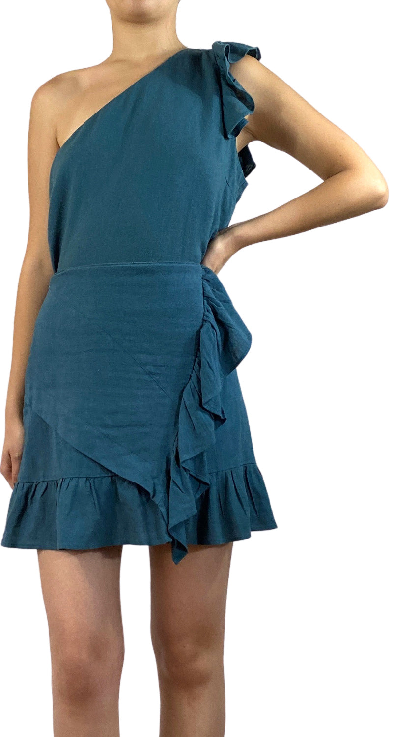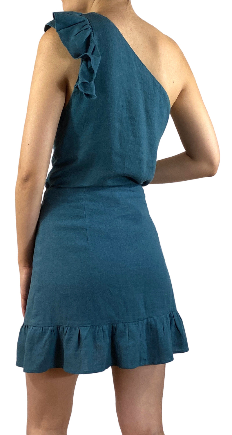 Top de Lino en color Verde, de corte asimétrico y vuelo en hombro.