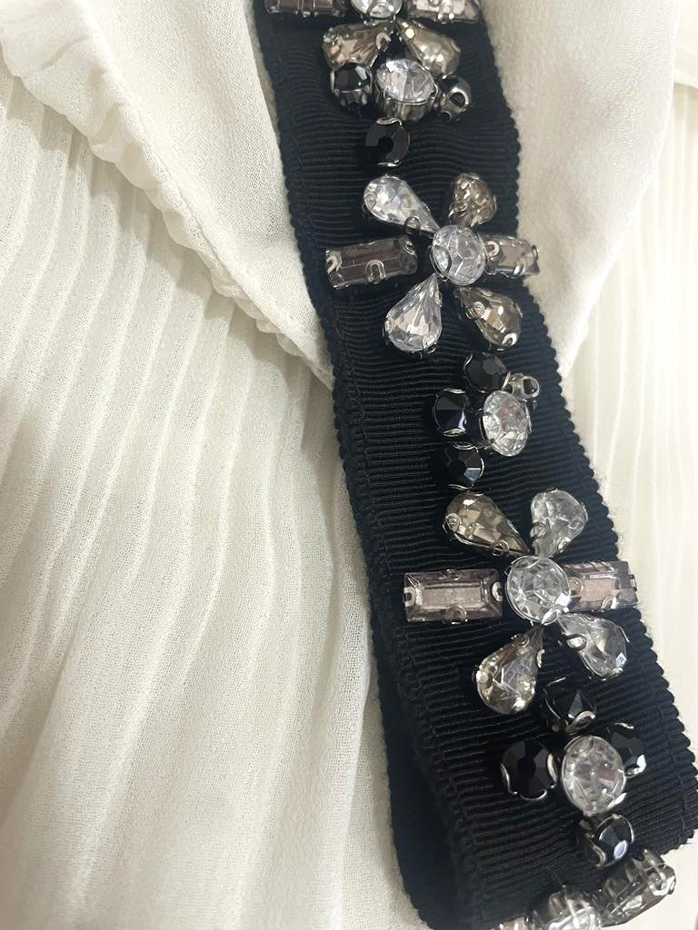 Top Blanco traslucido con vuelos y aplicaciones en los tirantes.