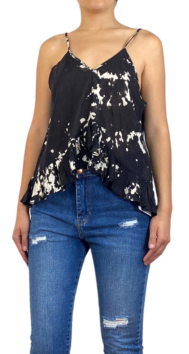 Top Tie Dye en Negro y Beige, escote en V, vuelos y tirantes ajustable.