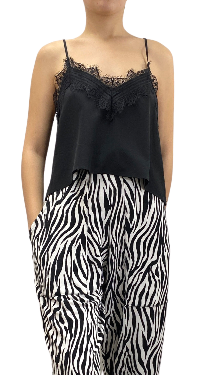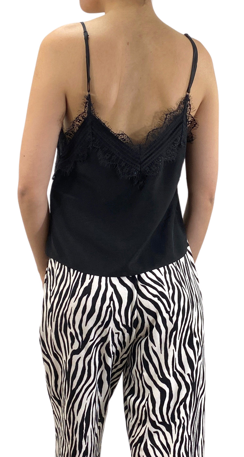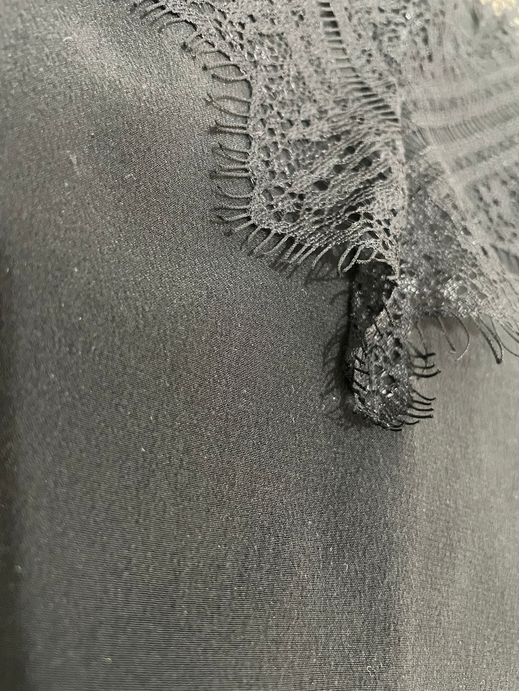 Top color Negro, escote en V con encaje, tirantes ajustables. No especifica talla.
